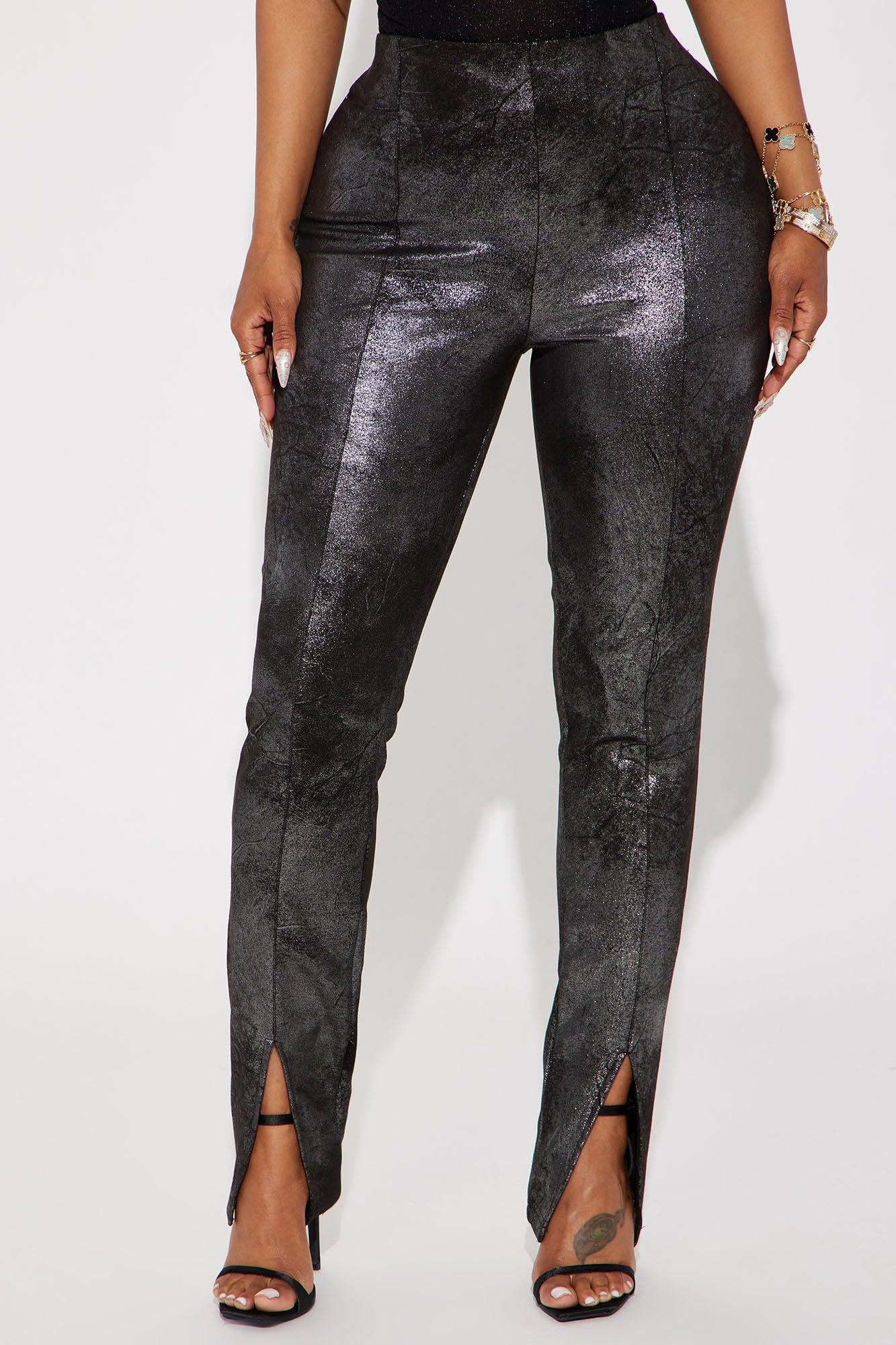 Available In Silver. Legging High Rise Split Hem Foiled Faux Suede Non Stretch Disclaimer: Due To The Printing Process A Difference In Saturation May Occur. Each Garment Is Unique. Print Placement Will Vary. Disclaimer: To Keep The Aesthetic Of This Garment, Please Follow The Care Instructions Carefully. 92% Polyester 8% Spandex Imported