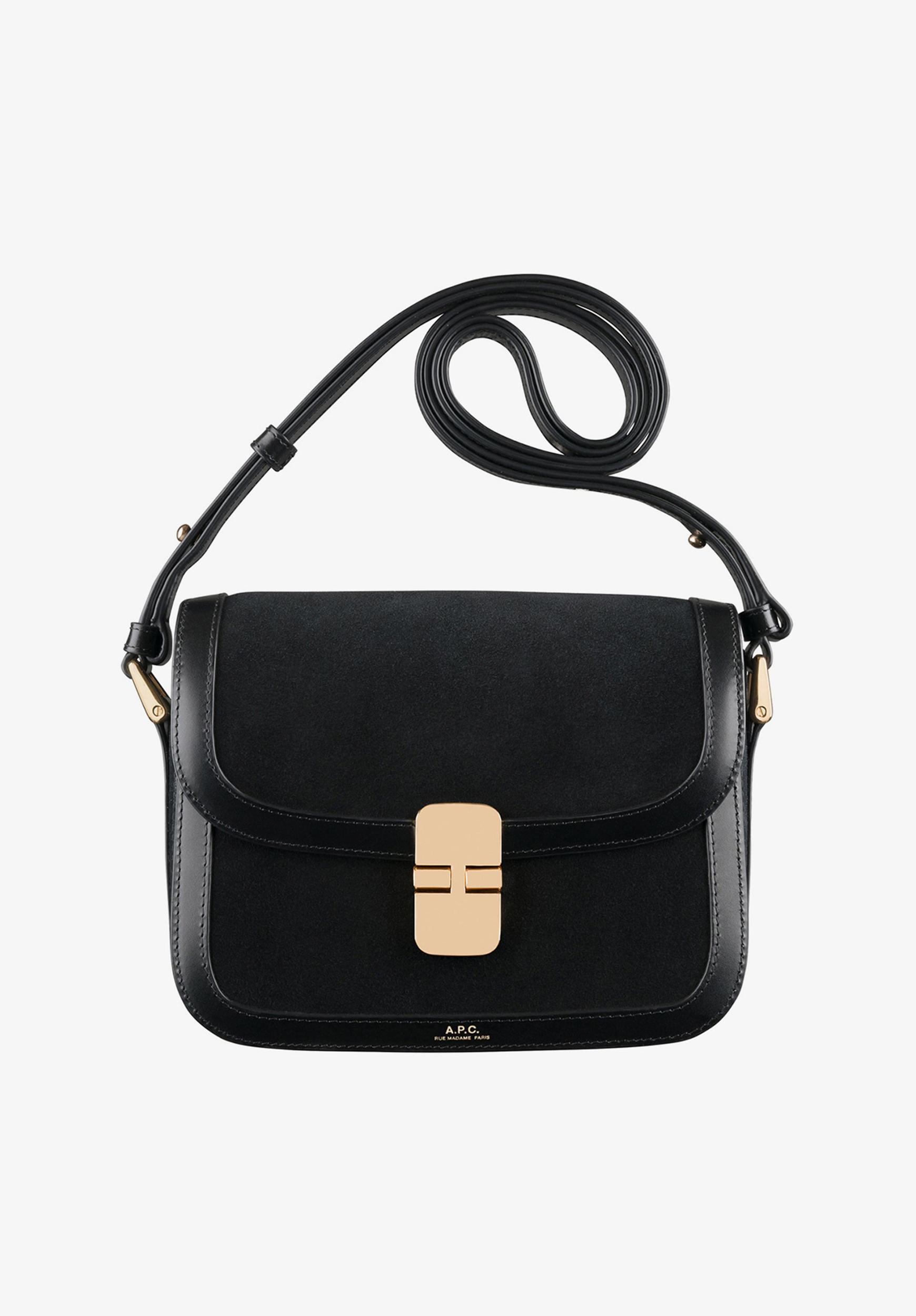 - Leather bag inspired by chic vintage clutch bags, in a small format. - Supple cowhide leather. - Adjustable leather shoulder strap. - Can be worn on the shoulder or across the chest. - Goldtone clasp. - Flap lined with cowhide suede split leather. - One large compartment. - Two large pockets. - Two goldtone rings on the sides. - Embossed goldtone 'A.P.C. Rue Madame Paris' logo.