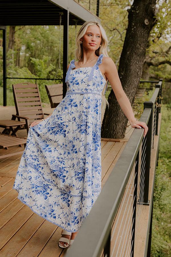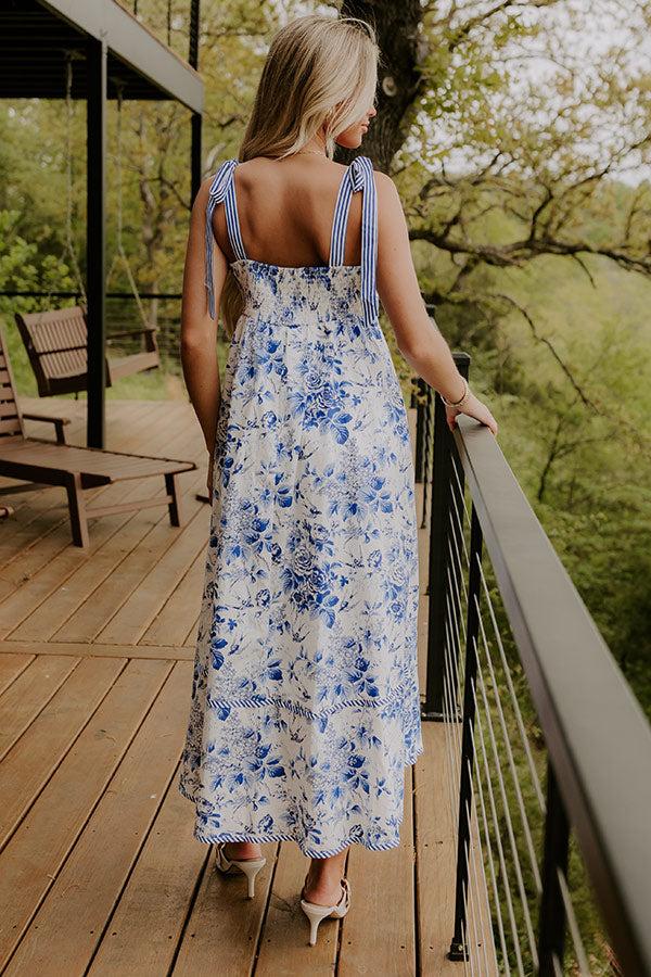 - Go on a serene stroll in this darling midi! The floral sparrow print brings the charm of a blooming garden to every step. Lined, lightweight material with a blue hued floral sparrow print - White and blue hued striped accents - A square cut neckline - Straps that tie into bows on the shoulders - A smocked back - A waistline with an elastic back - A flowy and flattering silhouette that ends in a straight, midi length hemline