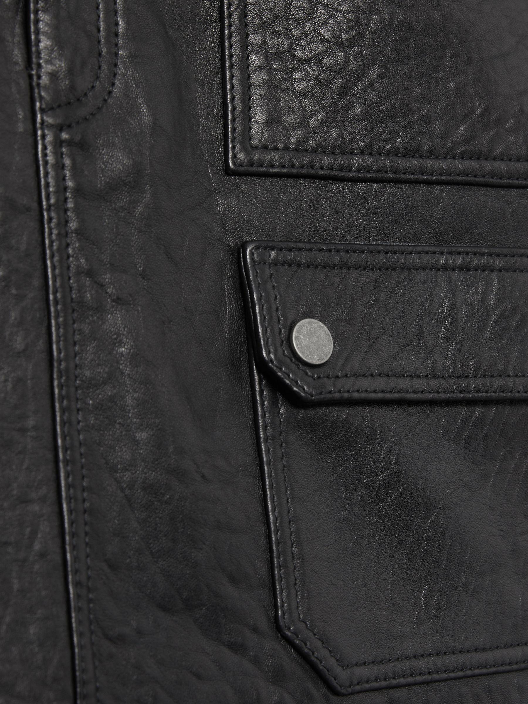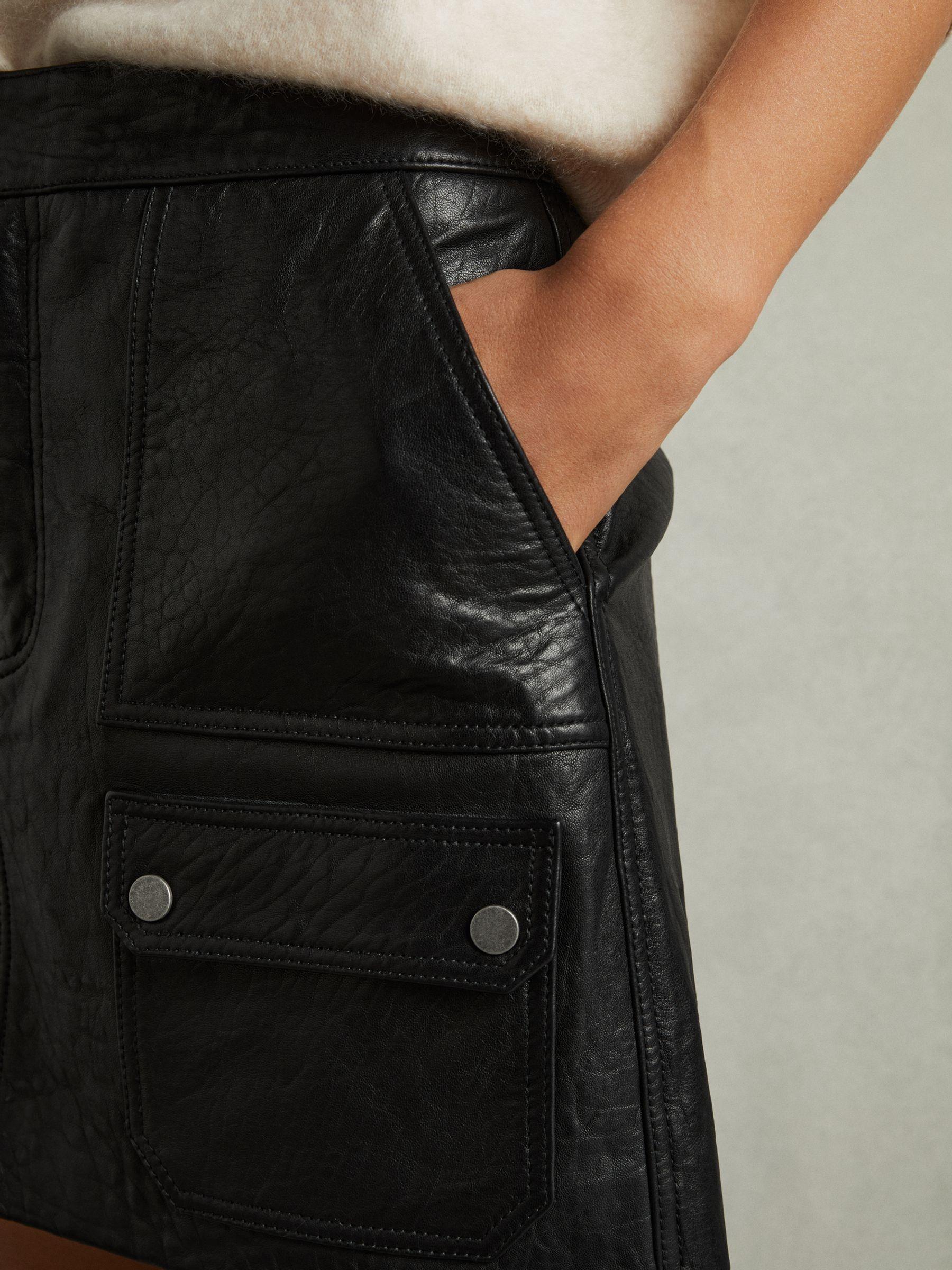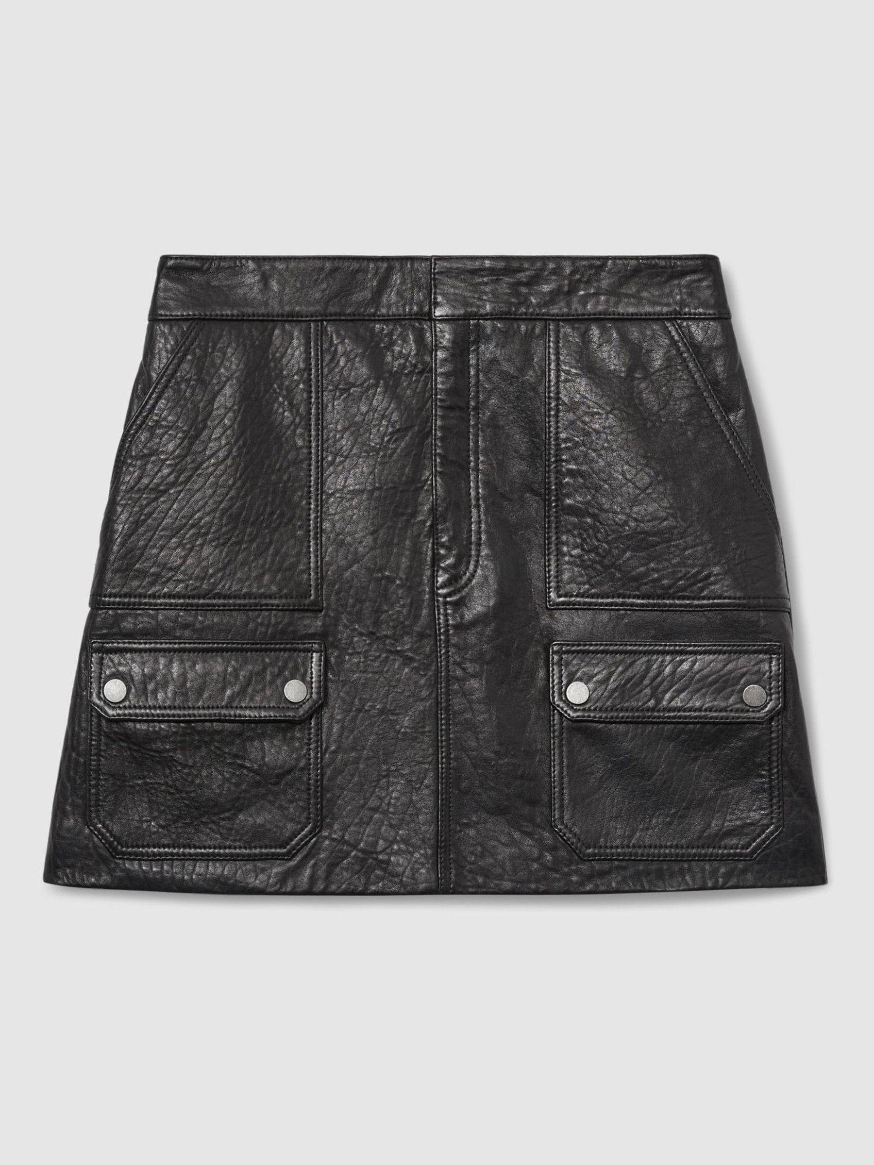 The butter-soft leather of the Parker mini skirt has a grained finish that draws inspiration from mid-century biker styles. Shaped to a high-rise silhouette and patched with pockets, it’s lined in satin, then finished with concealed front fastenings. Grained leather Patch pockets Silver-tone press studs Mini hem Satin lining Concealed front zip Hook and bar fastenings
