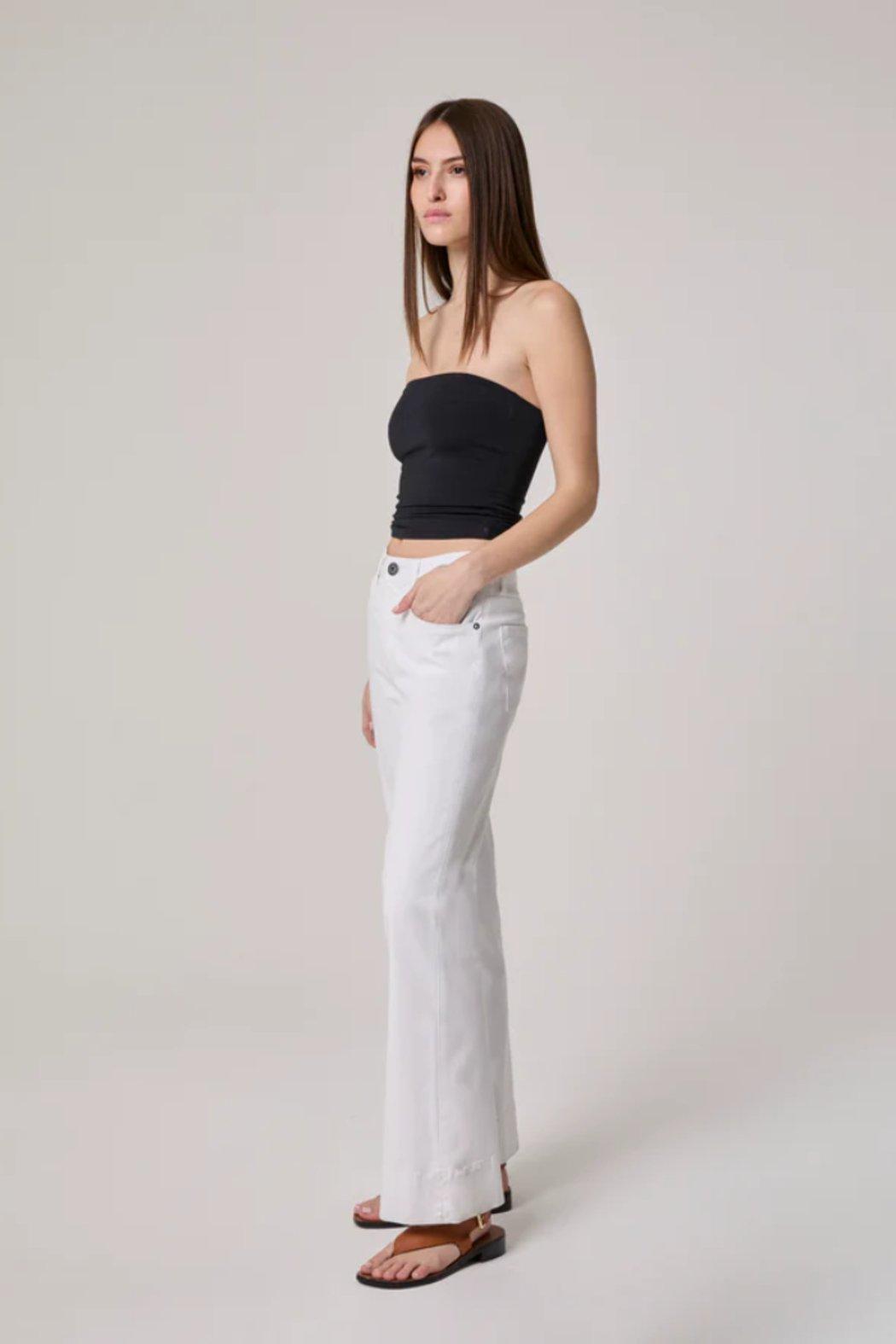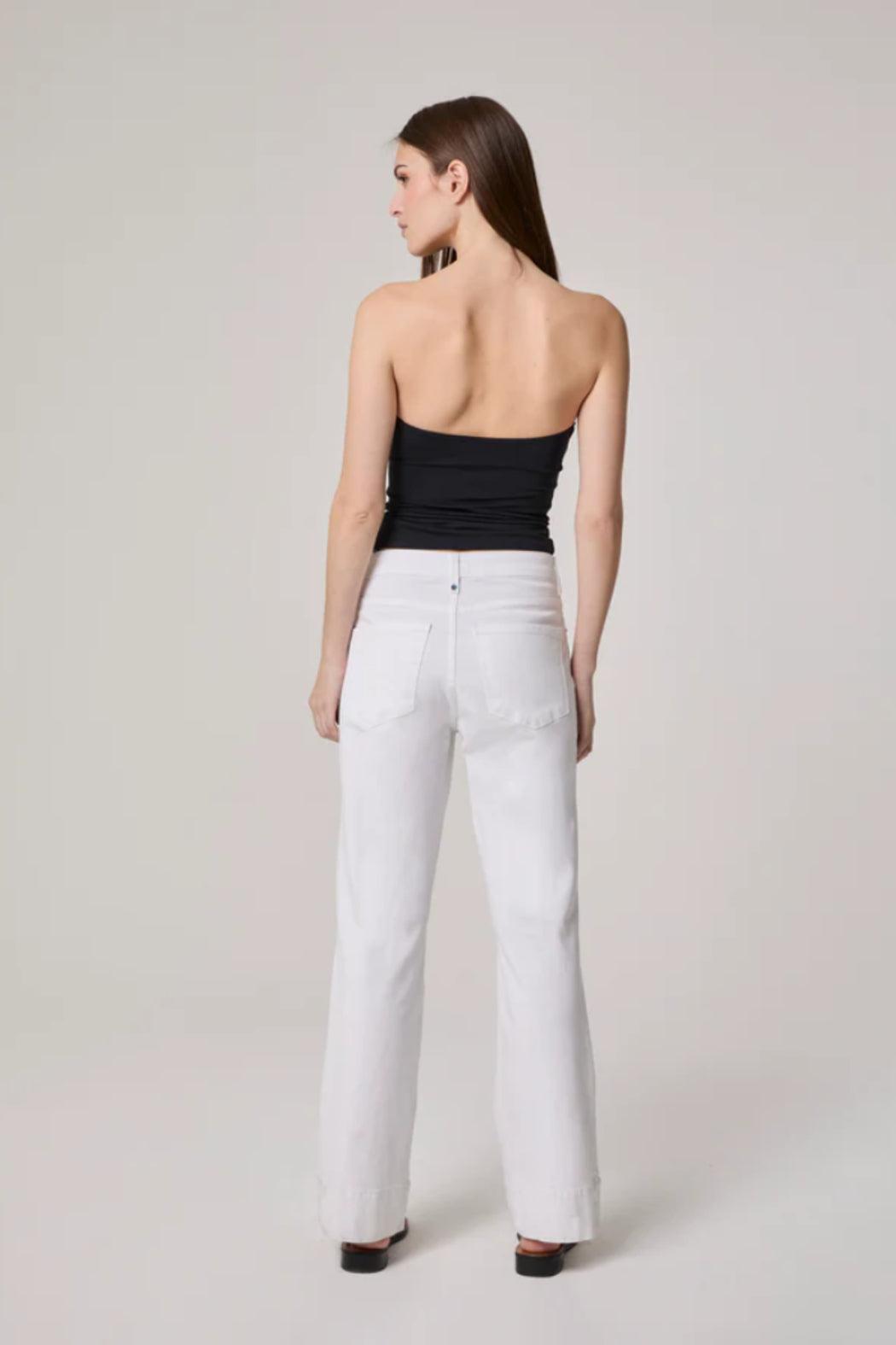 A high waisted full length flare that is fitted through the waist, hip and thigh with a wide hem.