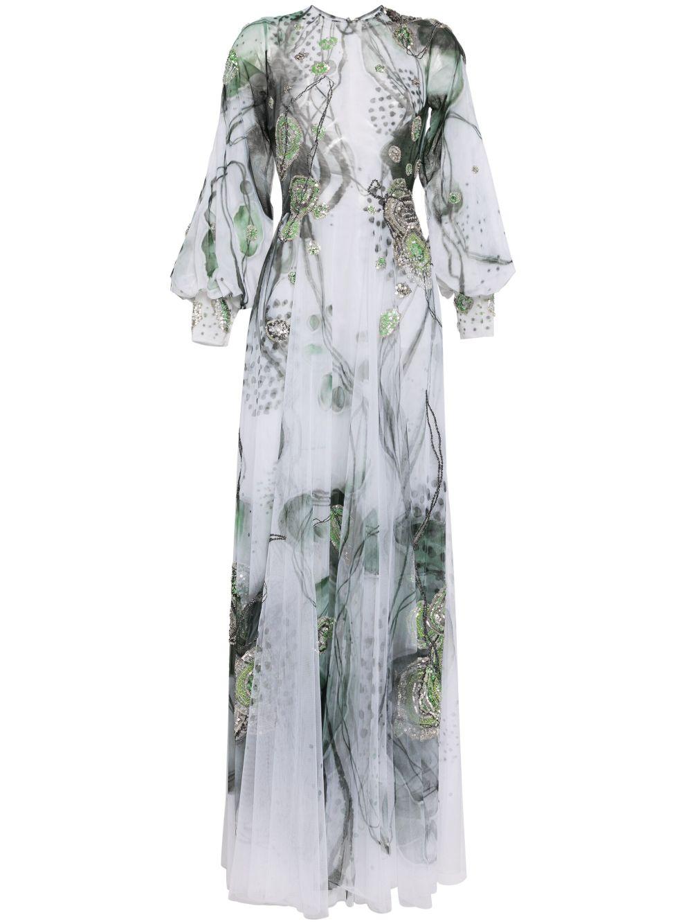 Saiid Kobeisy graphic-print beaded tulle dress | White | white/multicolour | tulle overlay | all-over graphic print | bead embellishment | round neck | concealed rear zip fastening | long sleeves | long length | straight hem | Polyester | Evening Dresses | Dresses | Clothing | Women