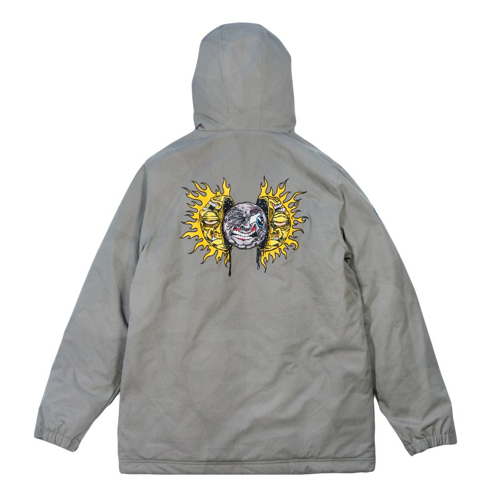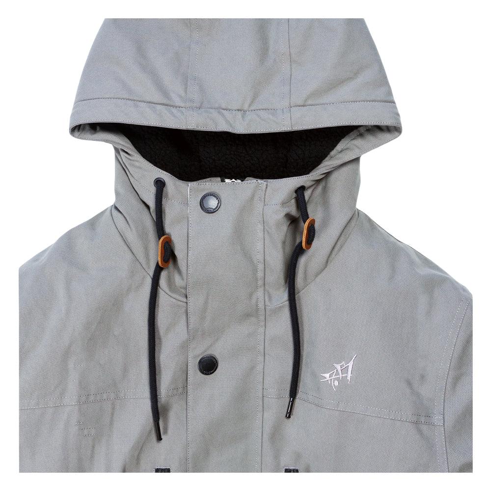 Fulfilled by our friends at Grassroots CaliforniaPresenting the Aaron Brooks Split Moon Gray Sherpa Parka Jacket A perfect parka with a durable Gray duck canvas exterior, soft sherpa fleece lining, and synthetic insulating layer for extra warmth. Hidden TPU laminate membrane makes adds 5k waterproofing while an elongated cut, sherpa fleece lined hood, and waist drawstrings add additional protection against the elements. Jacket features two front cargo pockets with hidden, fleece lined side access to warm hands on cold days. There are two YKK Zipper pockets on the exterior for storage and two hidden zipper pockets on the inside for the stash. Fully printed underflaps on pockets for stealthy design flare, leather sleeve patch, and an embroidered Aaron Brooks Split Moon graphic on the back.- Limited to 300 made