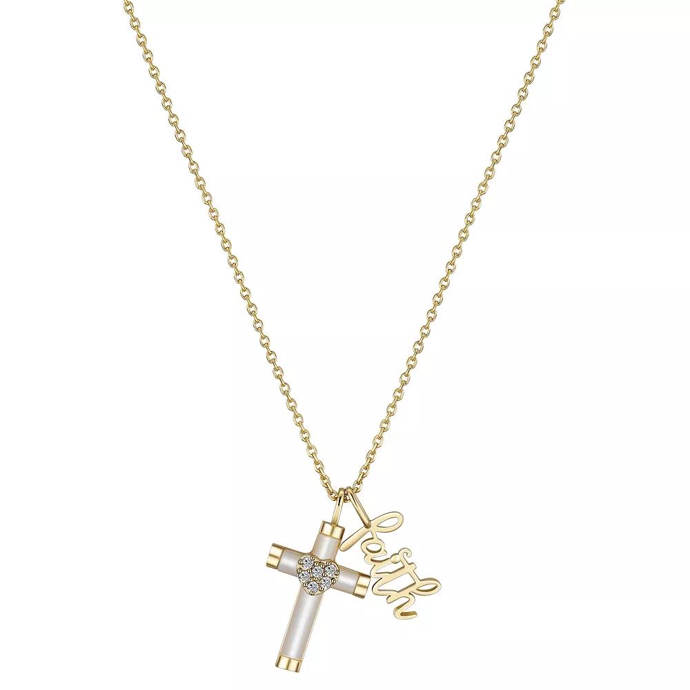 This gorgeous 14k gold plated mother of pearl and cubic zirconia cross "Faith" pendant necklace from Gratitude & Grace is sure to become a favorite in any jewelry collection. Click on this JEWELRY & WATCHES GUIDE to learn about fit, styles, materials and more! This gorgeous 14k gold plated mother of pearl and cubic zirconia cross "Faith" pendant necklace from Gratitude & Grace is sure to become a favorite in any jewelry collection. Click on this JEWELRY & WATCHES GUIDE to learn about fit, styles, materials and more! FEATURES Cross: 13 mm x 24 mm; Faith: 13 mm x 20 mm Chain length: 16-18" adjustable Chain type: cable Clasp: lobster-claw Nickel free Metal: brass Plating: 14k gold flash plated Finish: polished "Faith" inscription Packaging: boxedSTONE DETAILS Stone type: cubic zirconia, mother of pearl Shape: round, cross-shaped Setting: glue/epoxy Gemstones may have been treated to enhance their appearance. Special care may be required. Please visit our Gemstone Treatment & Special Care Guide for more information. Color: Gold Tone. Gender: female. Age Group: adult.
