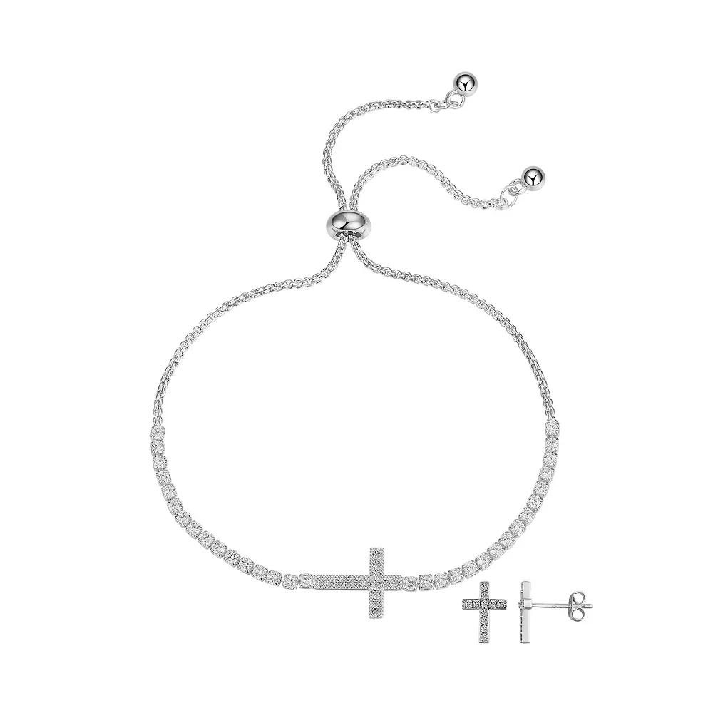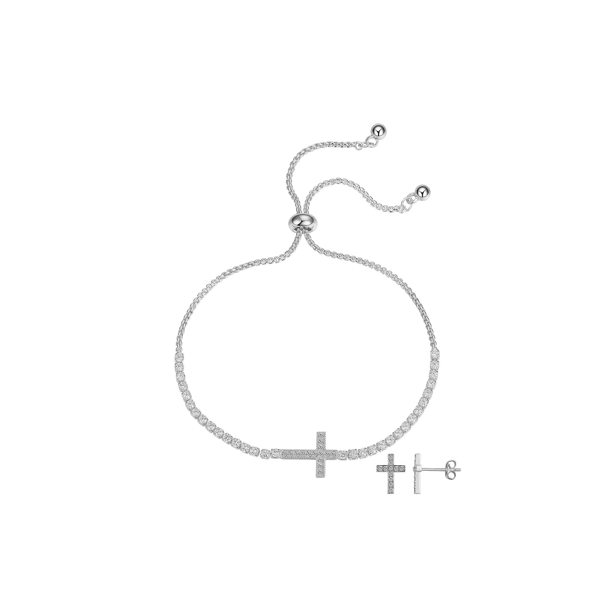 Display your faith with this cubic zirconia-embellished Gratitude & Grace fine silver plated cross necklace and stud earrings set. Click on this JEWELRY & WATCHES GUIDE to learn about fit, styles, materials and more! Display your faith with this cubic zirconia-embellished Gratitude & Grace fine silver plated cross necklace and stud earrings set. Click on this JEWELRY & WATCHES GUIDE to learn about fit, styles, materials and more! FEATURES Includes: 1 bracelet & 1 pair of earrings Bracelet length: 9.75 in. Clasp: bolo Earring diameter: 8.2 mm Backings: post Nickel free Metal: brass Plating: fine silver Finish: polished Packaging: boxedSTONE DETAILS Stone type: cubic zirconia Center stone size: 1.3 mm Shape: round Setting: wax Gemstones may have been treated to enhance their appearance. Special care may be required. Please visit our Gemstone Treatment & Special Care Guide for more information. Size: One Size. Color: Multicolor. Gender: female. Age Group: adult.