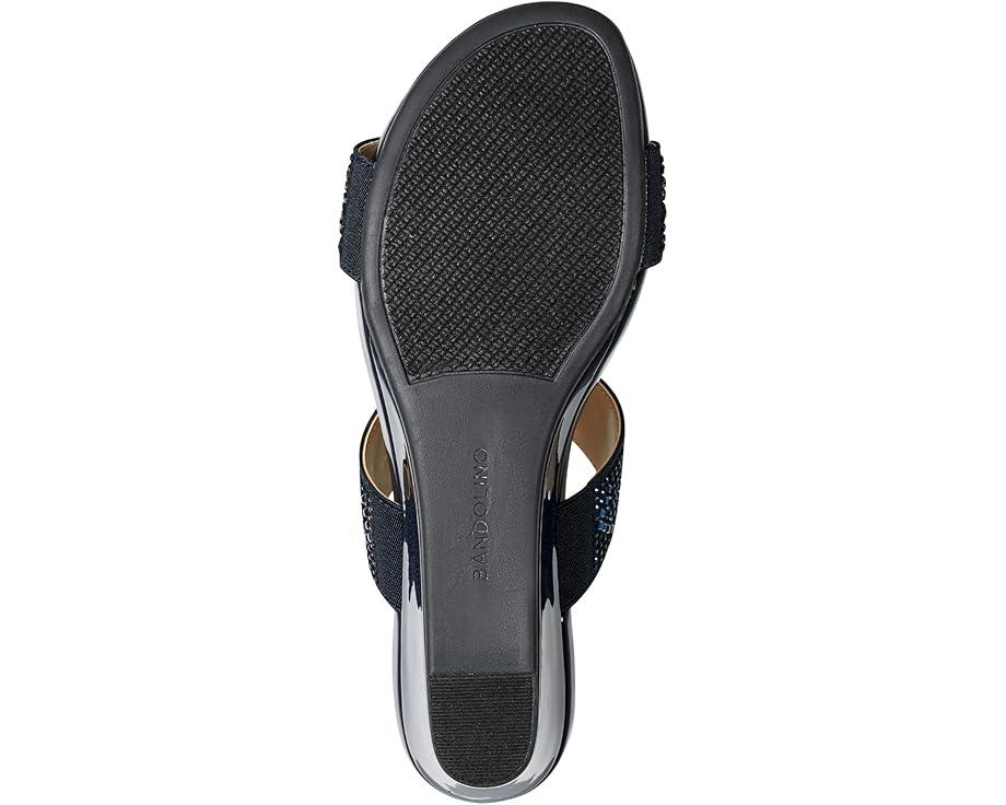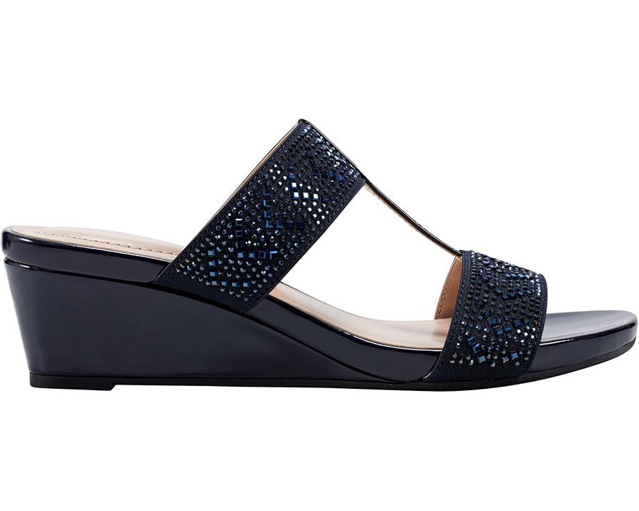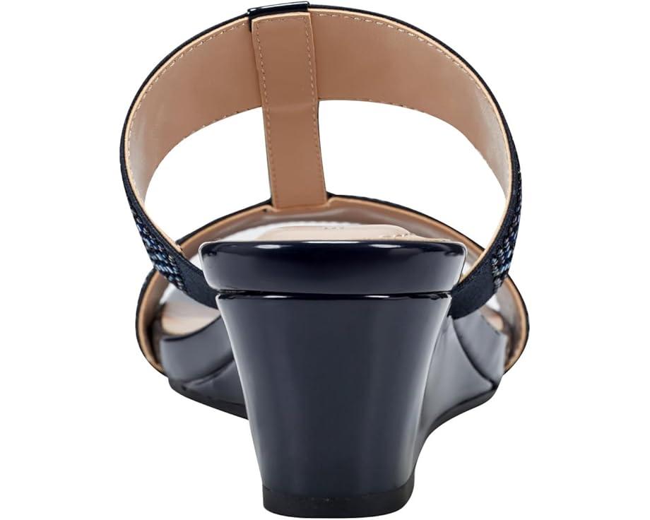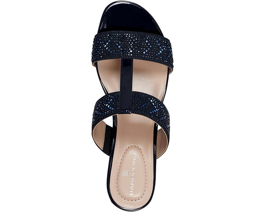 Get set for the endless fun wearing the Bandolino® Iluvit. Crafted from PU upper, man-made lining, and foam insole, this pair of slip-on sandals features wedge heel, open round toe, crystal-encrusted double strap on the vamp, and brand detailing on the footbed.