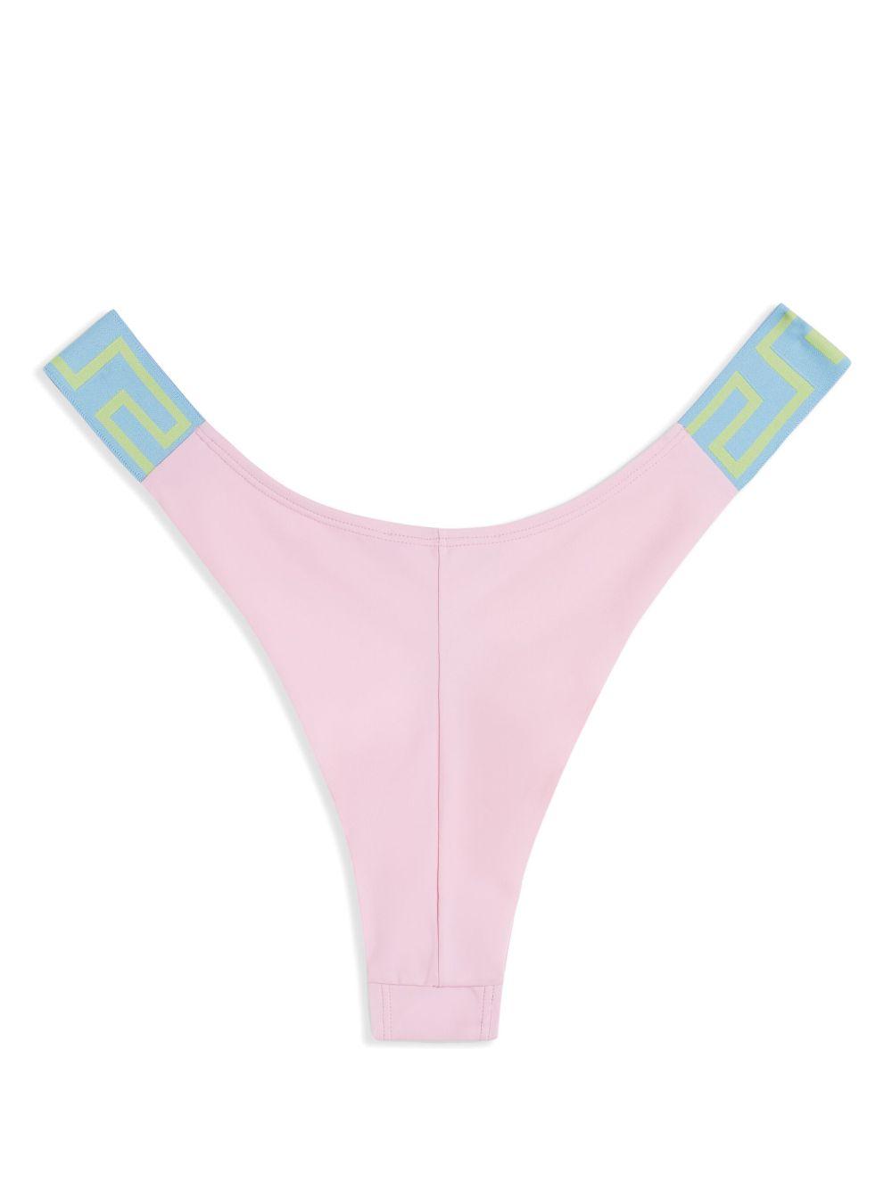 Versace Greca Border low-rise bikini bottoms | Pink | light pink/light blue | ECONYL® | stretch-design | signature Greca detailing | low-rise | elasticated waistband | Brazilian style | high cut | Be mindful to try on swimwear over your own garments. | ECONYL®/Elastane/ECONYL®/Elastane | Bikinis | Beachwear | Clothing | Women