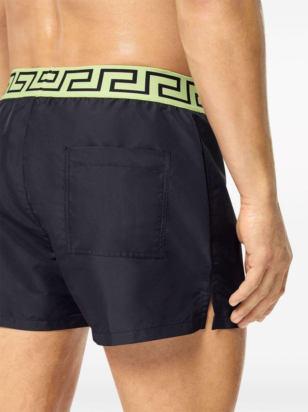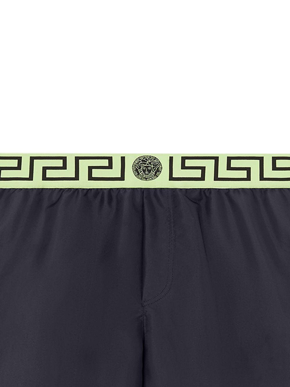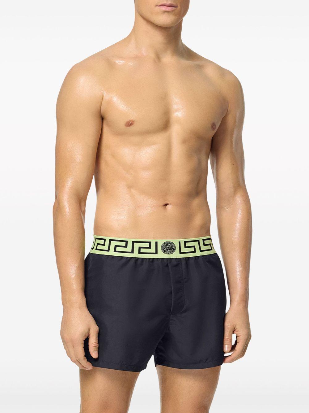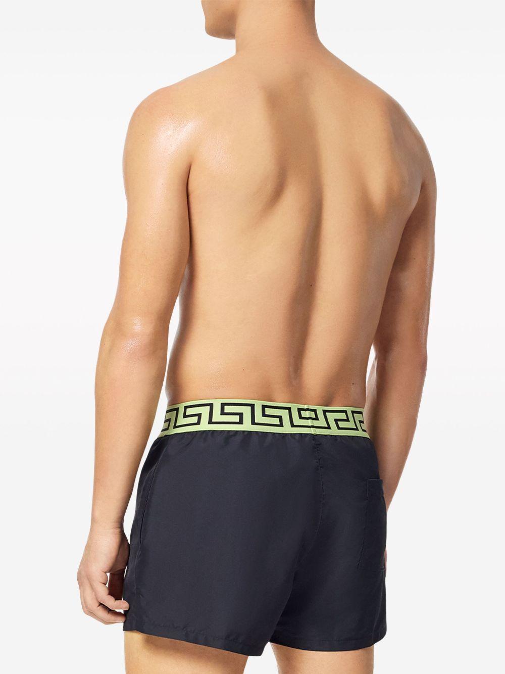 Versace Greca-jacquard swim shorts | Black | black/light green | elasticated waistband | signature Greca detailing | two side slit pockets | rear patch pocket | side slits | thigh-length | Be mindful to try on swimwear over your own garments. | Nylon/Elastane/Polyester | Swim & Board Shorts | Swimwear | Clothing | Men