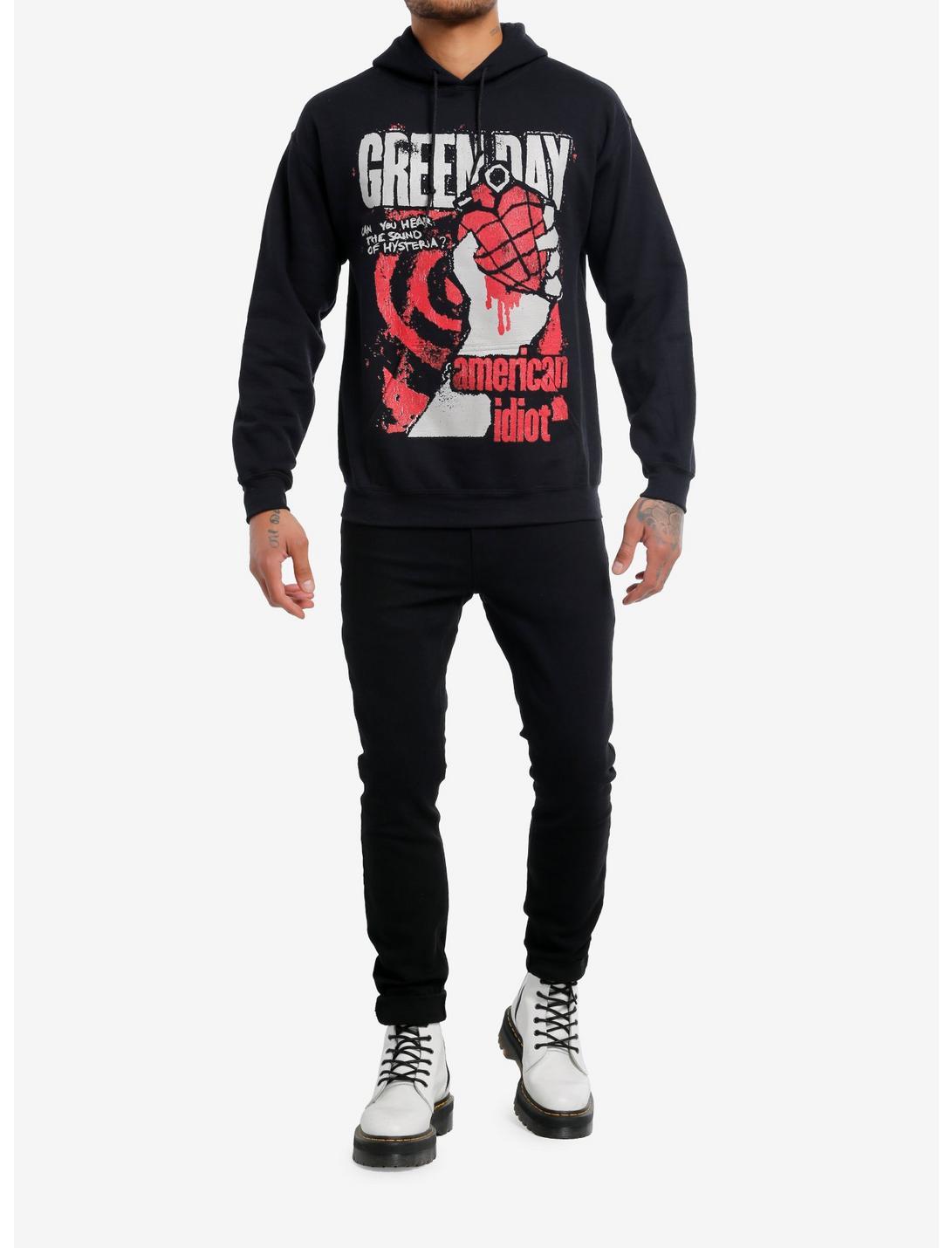 Don't wanna be an American idiotDon't want a nation under the new mediaAnd can you hear the sound of hysteria?Can you believe Green Day's American Idiot (2004) is 20 years old? This hoodie shows a jumbo graphic of artwork inspired by the album cover, with a line from the title track. Front kangaroo pocket and drawstring hood.50% cotton; 50% polyesterWash cold; dry lowImportedListed in men's/unisex sizesModel is 6'1"Model wears size Medium
