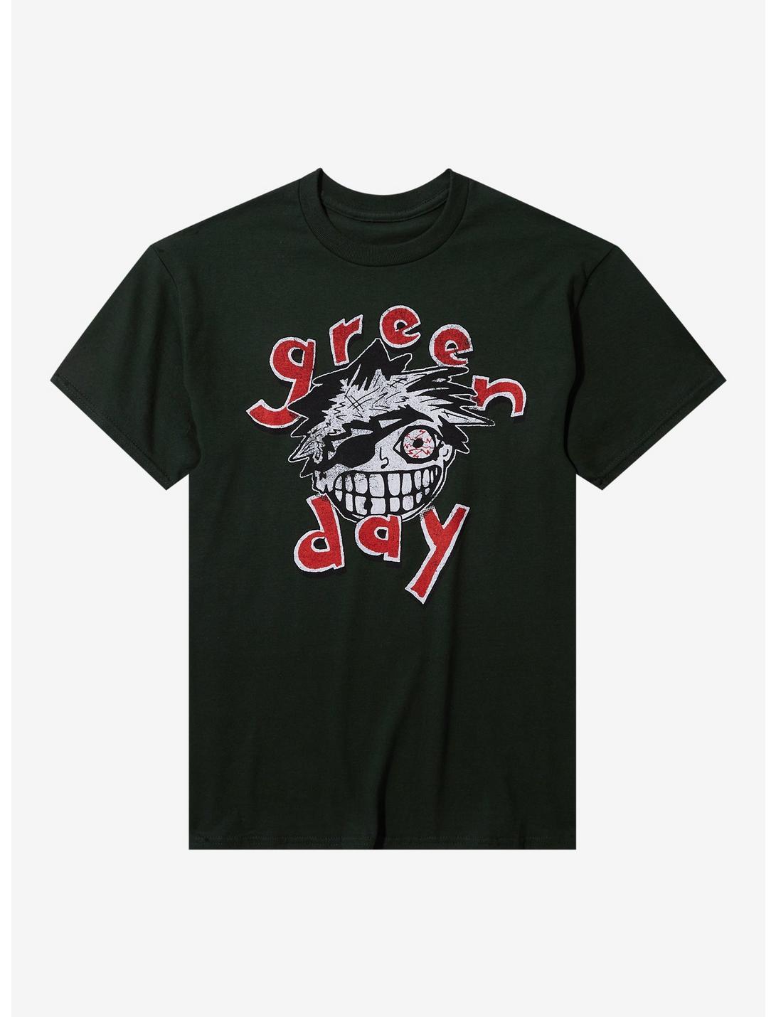 Never hurts to add just one more Green Day tee to your collection! This dark green style shows a cartoonish face grinning, wearing an eye patch with the other eye totally bloodshot. It says the band's name in red above and below.100% cottonWash cold; dry lowImportedListed in men's/unisex sizes