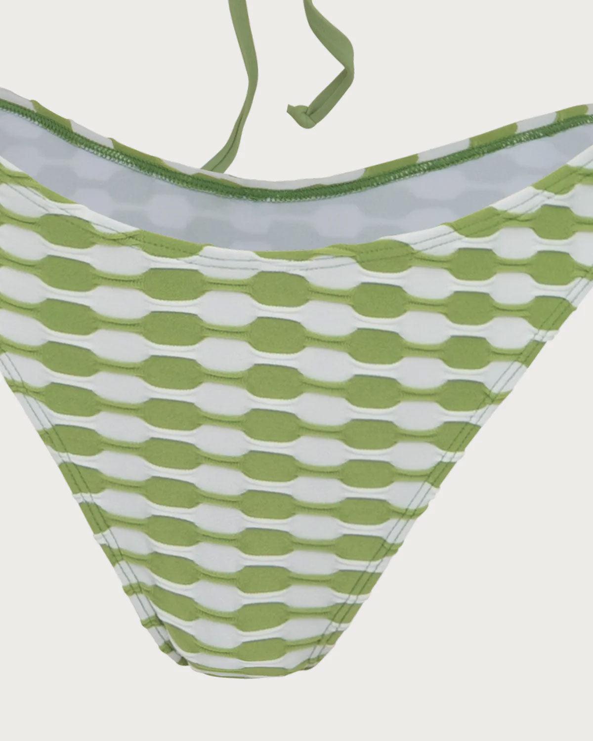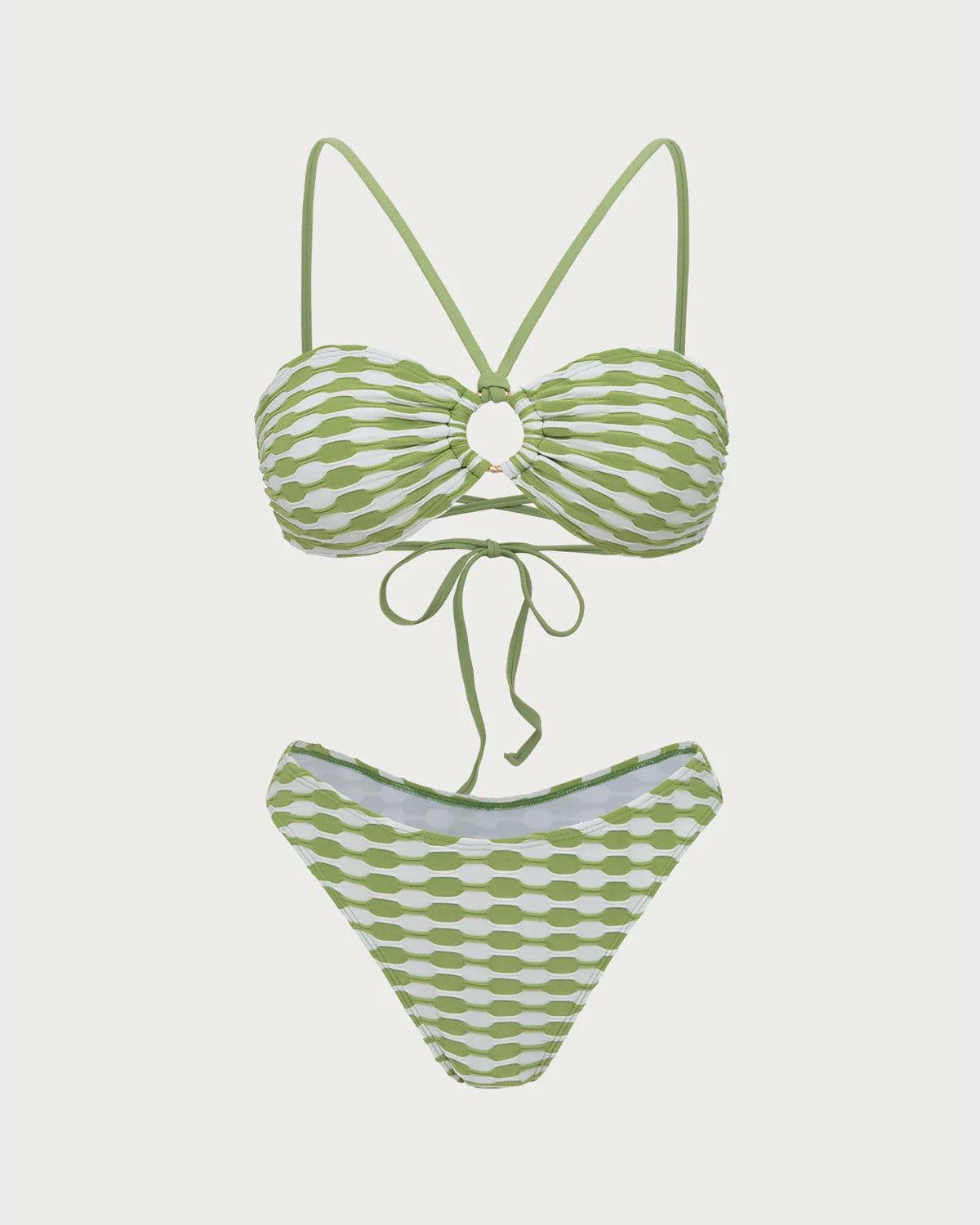 Fabric: 90%polyester, 10%Spandex Lining: 90%polyester, 10%Spandex Back Neckline: X Cross Fabric Stretch: High Stretch Waist: Low Waisted Closure Type: Elastic Waist Pattern Type: Geometric Embellishment: Textured, Jacquard, O-Ring,Knot, Tie, Contrasting colors Neckline: Spaghetti Strap Fabric: Polyester 90.0%, Spandex 10.0% Lining: Polyester 90.0%, Spandex 10.0% Leg Opening: Mid Cut Leg Padding: Removable Soft Cups Bottom Coverage: Moderate Bottom Coverage Bra Coverage: Demi