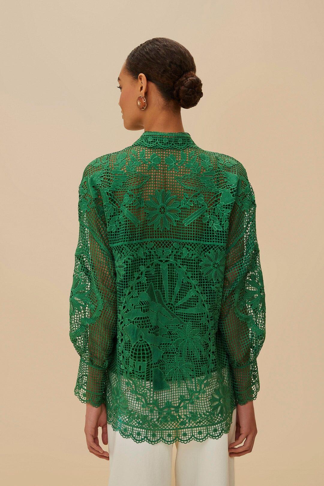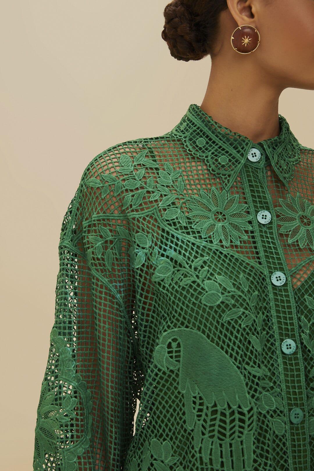 Embrace the vibrant charm of the Green Landscape Guipure Shirt. Crafted from intricate guipure lace, it envelops you in rich emerald hues adorned with playful parrot and floral motifs. The collar neckline adds a touch of elegance, while the flowing silhouette offers a whimsical flair. Perfectly capturing the spirit of tropical whimsy, this shirt brings a lush garden to life with its delicate craftsmanship and playful design. Closure: Center front buttons Button type: Plastic button Sleeve type: Long sleeve Composition 55% LINEN 45% VISCOSECare Instructions HAND WASH SEPARATELY, DO NOT BLEACH, DO NOT TUMBLE DRY, DRY FLAT, IRON AT LOW HEAT, DRY CLEAN WITH ANY SOLVENT EXCEPT TRICHLOROETHYLENESize and Fit Inches XXS XS S M L XL Bust 41 3/4 43 3/4 45 3/4 47 3/4 50 3/4 54 Waist N/A N/A N/A N/A N/A N/A Length 26 2/4 27 27 2/4 28 1/4 28 3/4 29 1/4 Hip 43 1/4 45 1/4 47 1/4 49 1/4 55 2/4 55 2/4