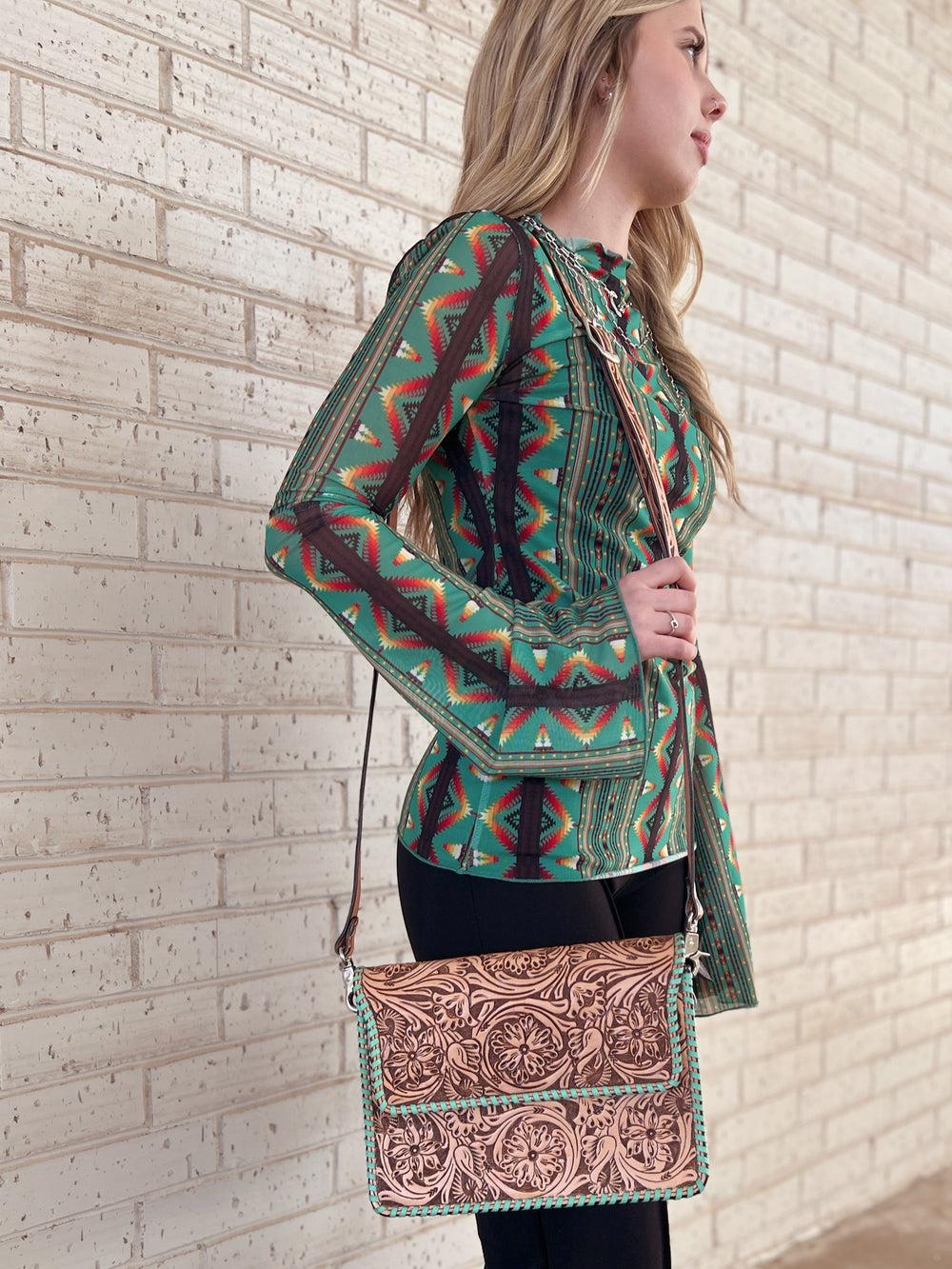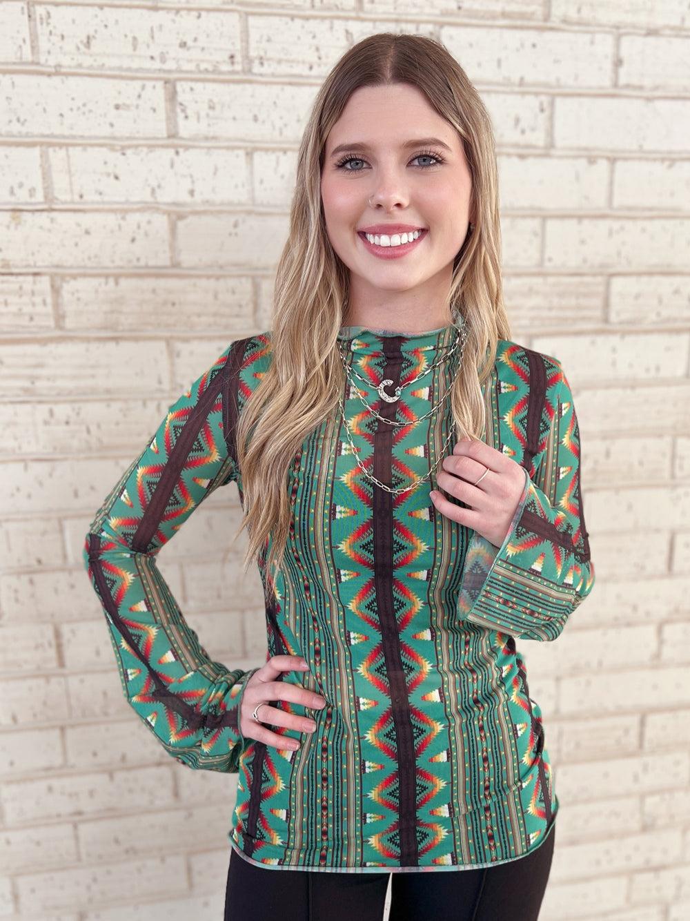 Green Southwestern Aztec Bell Sleeve Mesh Top*