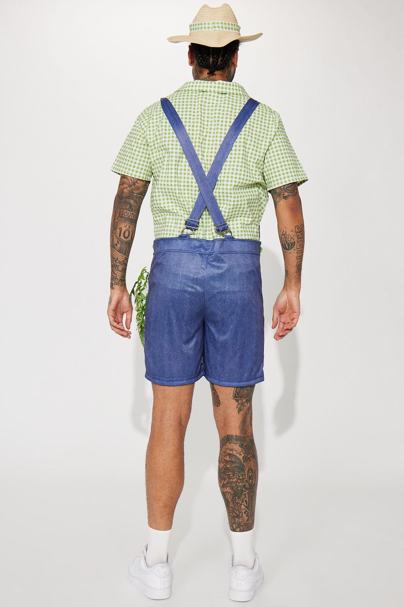 Available In Green. Herbal Farmer Costume Shorts Overalls With Green And White Gingham Details Included Gingham Shirt With Velcro Closure Included Pocket Handkerchief And Leaves Included Hat Included Bandana Included Final Sale 100% Polyester Imported
