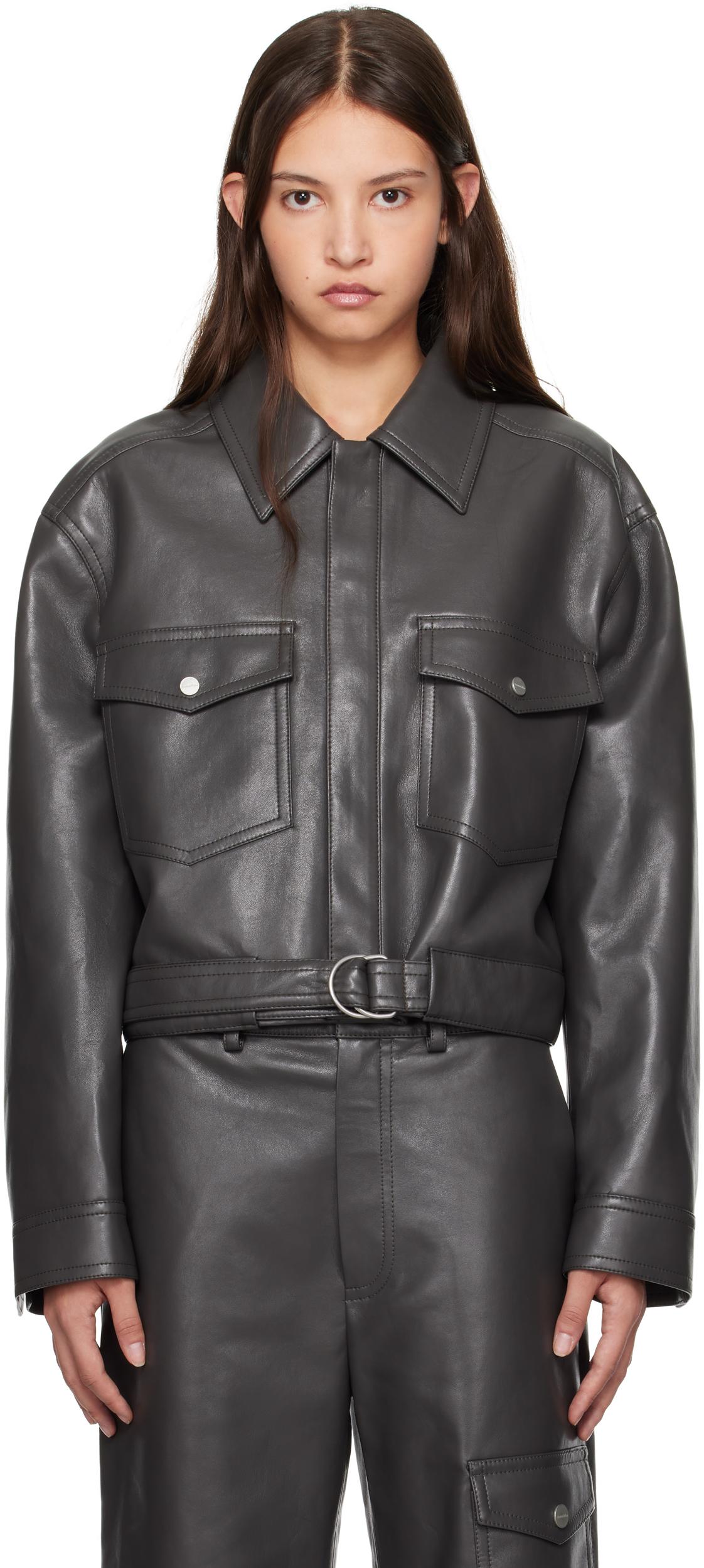 Grained regenerated leather and vegan leather jacket. · Spread collar · Concealed press-stud closure · Integrated cinch belt at cropped hem · Single-press-stud barrel cuffs · Full twill lining Supplier color: Midnight green