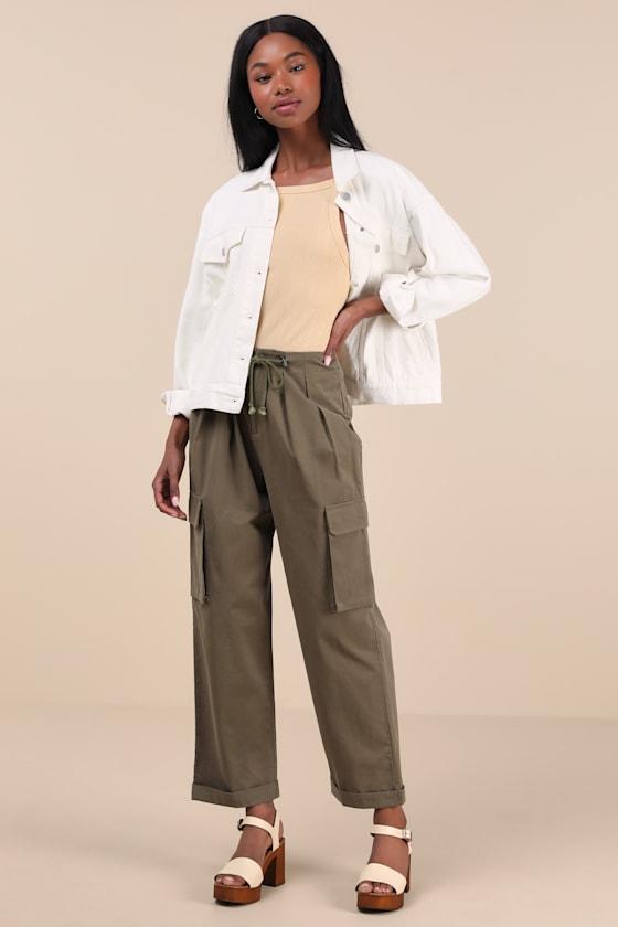 The Lulus Greeta Olive Green Straight Leg Cargo Pants are a utilitarian-chic option for those extra hot summer days! These lightweight woven pants feature a high-rise waist with a tying drawstring detail, pleated details, and a top button closure above a hidden zip fly. Straight pant legs boast cargo-style pockets along the sides, back welt pockets, and cuffed, ankle-length hems that complete the look.