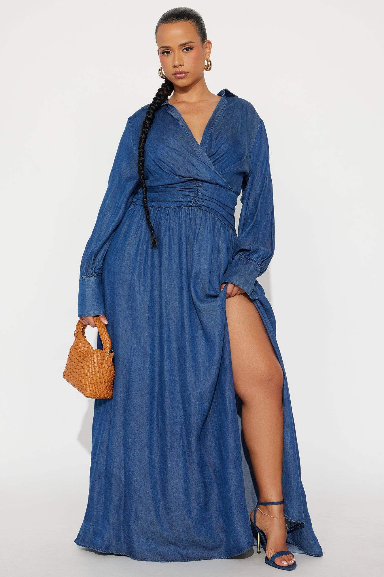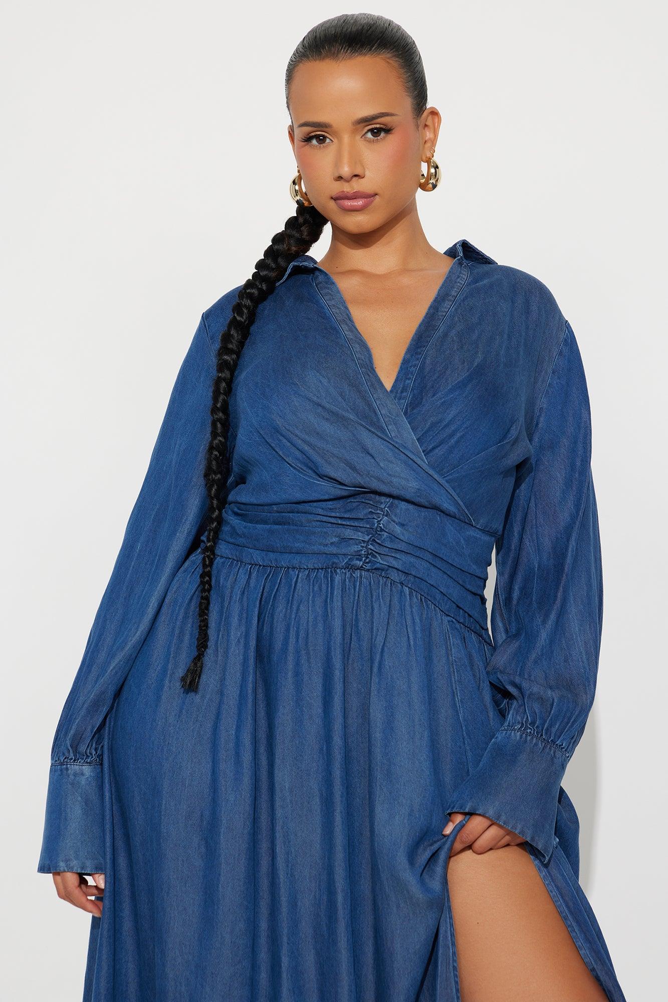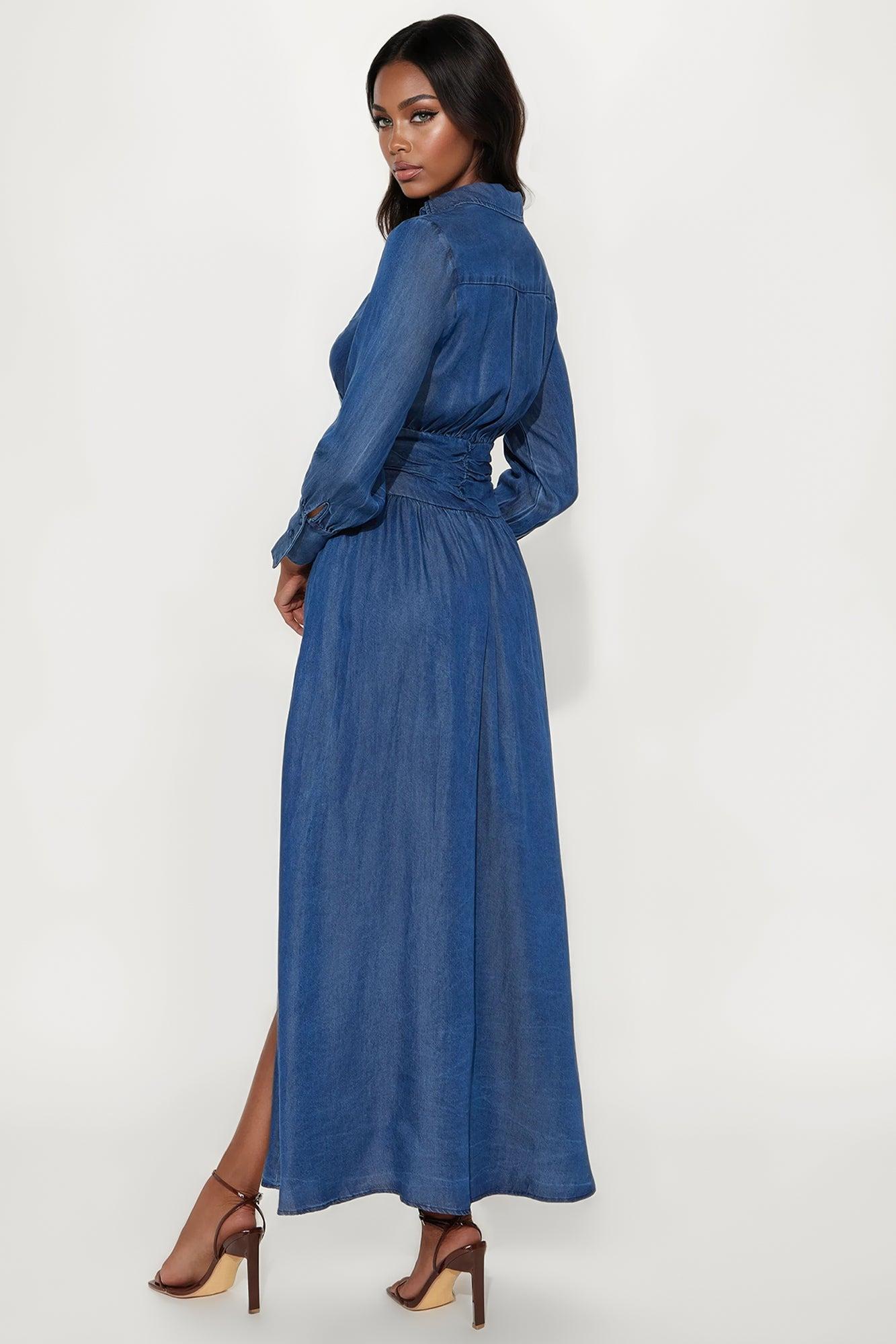Available In Denim. Denim Maxi Dress Collar Surplice Neckline Long Sleeve Ruched Waist Hidden Side Zipper Slit No Stretch Disclaimer: Due To The Specialized Dye And Printing Process A Difference In Saturation May Occur. Each Garment Is Unique 100% Rayon Imported