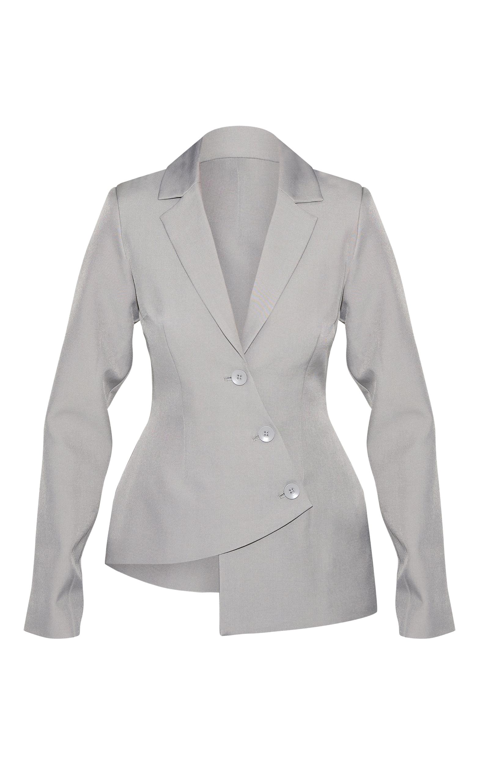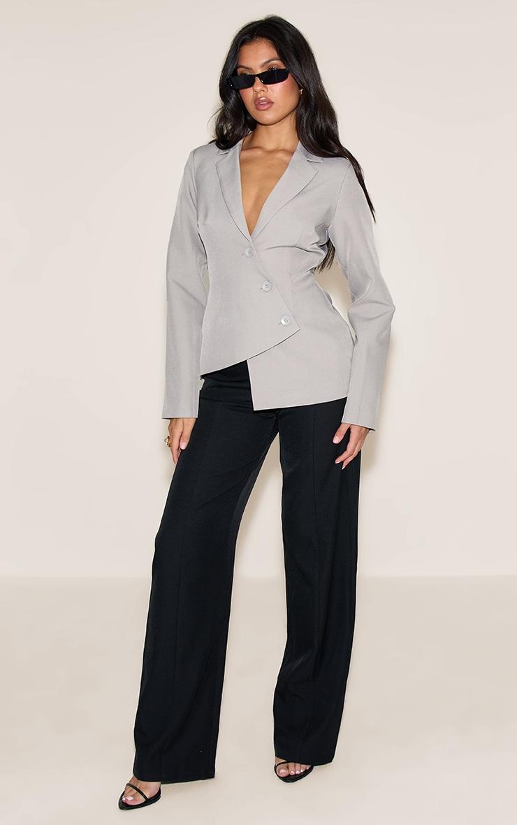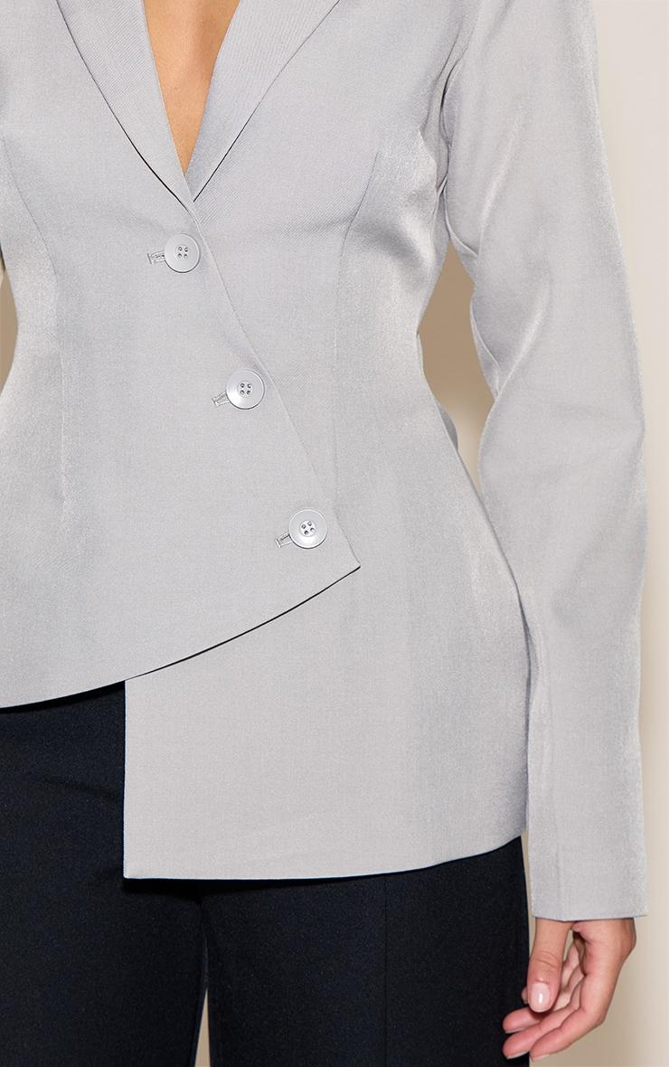 Own the room with a confident cut. This grey asymmetric button blazer features a sharp lapel collar and a deep V-neckline, leading to a distinctive asymmetric hem. The diagonal three-button fastening cinches the waist for a defined silhouette. Crafted from polyester, it holds its sleek form. For evening, pair it with tailored black pants and sharp stiletto heels. The ultimate choice for an impactful, refined look.Length approx 48.5cm/19inch (Based on sample size US 4)Model wears size UK 8/ EU 36/ AUS 8/ US 4Model Height - 5ft 7inchp]:!mb-4inch>Brand: PrettyLittleThingCategory: OuterwearProduct type: Fitted BlazerColor: GreyMaterial: Tailored WovenOccasion: Evening