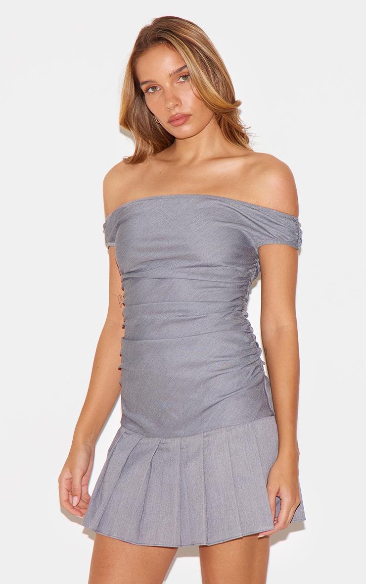 Invest in considered minimalism with this contemporary take on the classic shift dress. Crafted in a sophisticated grey hue, this piece features a bardot neckline that elegantly frames the décolletage, while the ruched detailing adds subtle textural interest. The refined pleating creates movement and dimension, elevating the silhouette. Accentuate the understated design with a sculptural ring from our jewelry collection for a modern, confident look. Length approx 58cm/23inch (Based on a sample size UK 8) Model wears size UK 8/ EU 36/ AUS 8/ US 4Model Height - 5ft 8inchp]:!mb-0inch>Category: DressesProduct type: Shift DressColor: GreyMaterial: Tailored WovenNeckline: BardotSleeves: ShortOccasion: Day