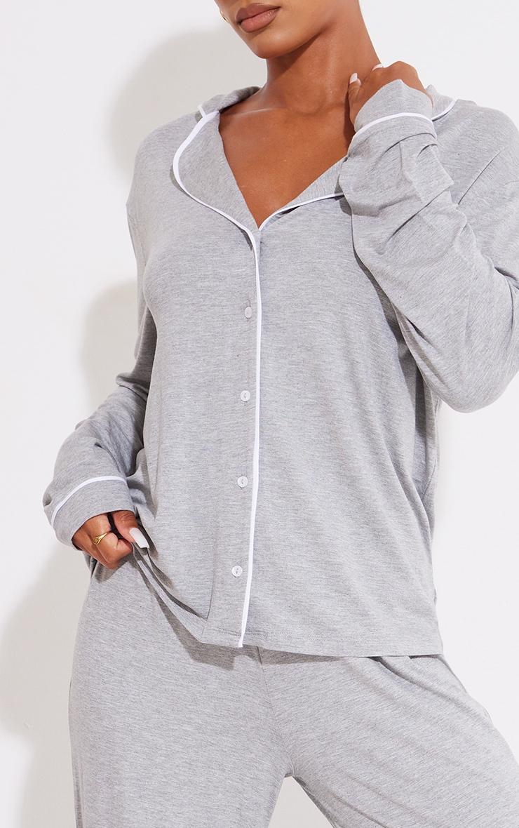 Embrace refined downtime with this grey jersey pajama set, a masterclass in understated elegance. Crafted from a soft, breathable jersey, this set features a long-sleeved shirt and coordinating bottoms, both finished with delicate piping for a touch of elevated detail. The relaxed, oversized fit ensures ultimate comfort without compromising on style. Consider this your new essential for effortless evenings and weekend lounging. Top length approx 66cm/26inch (Based on a sample size S) Bottoms length approx 78cm/30inch (based on a sample size UK 8) (Based on a sample size S) Model wears size UK 8/ EU 36/ AUS 8/ US 4Model Height - 5ft 7inchp]:!mb-4inch>Brand: PrettyLittleThingCategory: Lingerie & NightwearProduct type: Long PJ SetColor: GreyMaterial: Cotton JerseyDesign: PlainOccasion: Day