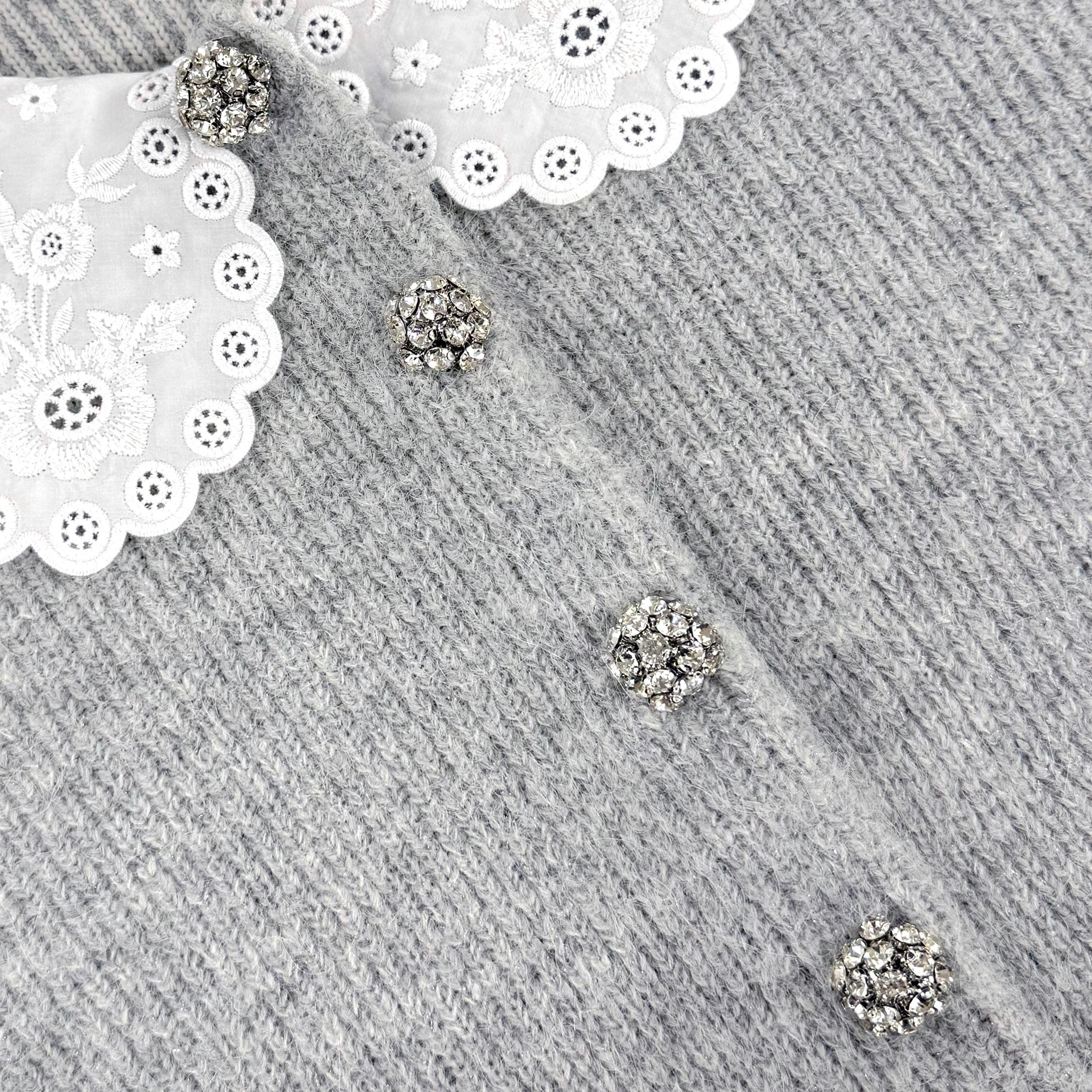 A contrast broderie anglaise collar adds artful detail to this grey fluffy knit cardigan. Cut with a relaxed fit, style with baggy jeans for weekend brunch or add a leather mini for a hot date. True to sizeFabric has stretchSnap popper closure at frontRelaxed fitDiamanté button embellishmentModel is 5ft10/178cm and wears a size S