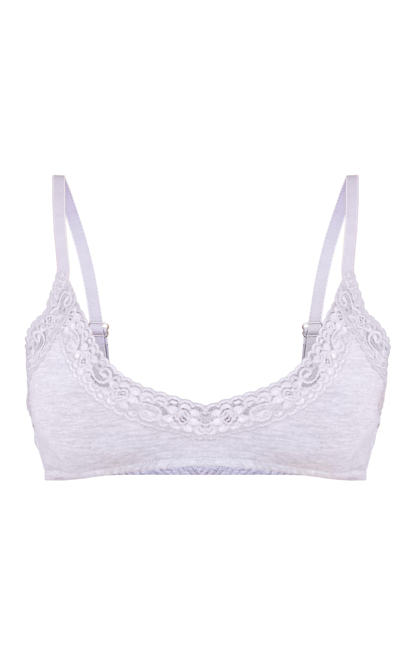 The grey lace trim triangle bra is a chic and lightweight lingerie option. Its soft lace trim adds sophistication while providing comfortable support. Layer under low-cut tops for a hint of elegance, or pair with matching lace briefs for a coordinated set.Length approx 29cm/11.5inch (Based on sample size S)Model wears size SModel Height - 5ft 6inchp]:!mb-4inch>Brand: PrettyLittleThingCategory: Lingerie & NightwearProduct type: BraColor: GreyMaterial: Jersey RibDesign: PlainOccasion: Day