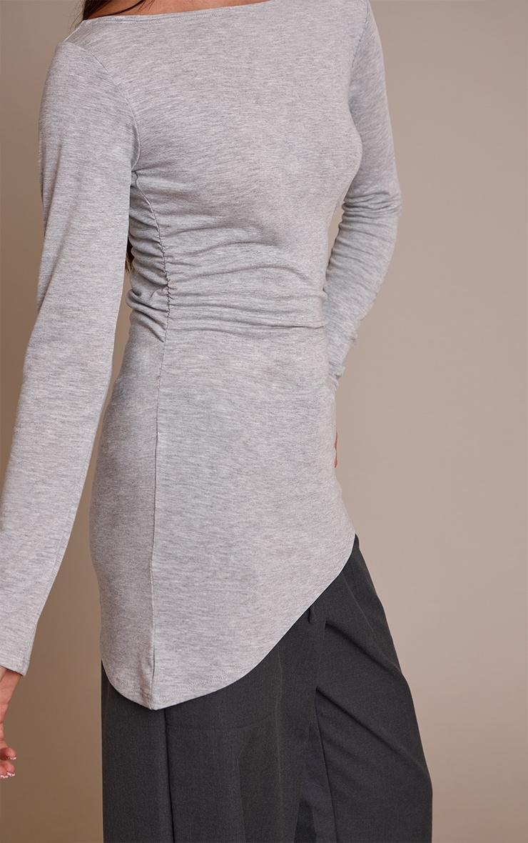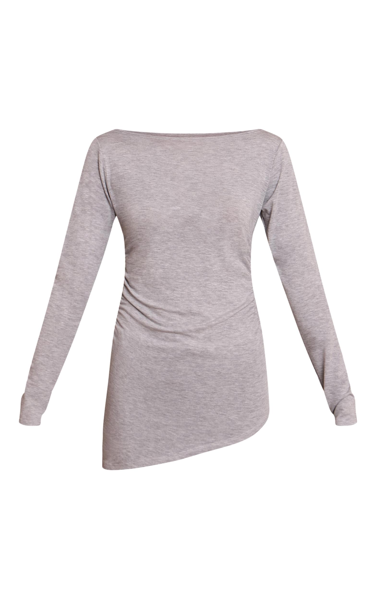 Elevate your base layers with a modern statement. The grey marl asymmetric hem detail long sleeve top is the ultimate blueprint for considered style; its elegant boat neckline and sleek long sleeves lay the foundation, while the distinctive asymmetric hem and artful side ruching introduce a contemporary edge to the classic grey marl hue. Pair this versatile top with sharp tailored pants or relaxed wide-leg jeans, completing the look with sharp black kitten heels and minimal gold hoops for an effortlessly polished finish that moves seamlessly from day appointments to after-work plans.Length approx 48.5cm/19inch (Based on sample size US 4)Model wears size UK 8/ EU 36/ AUS 8/ US 4Model Height - 5ft 7inchp]:!mb-4inch>Brand: PrettyLittleThingCategory: TopsProduct type: Fitted T-ShirtColor: Grey MarlMaterial: Single JerseyNeckline: Straight NeckSleeves: LongOccasion: Day
