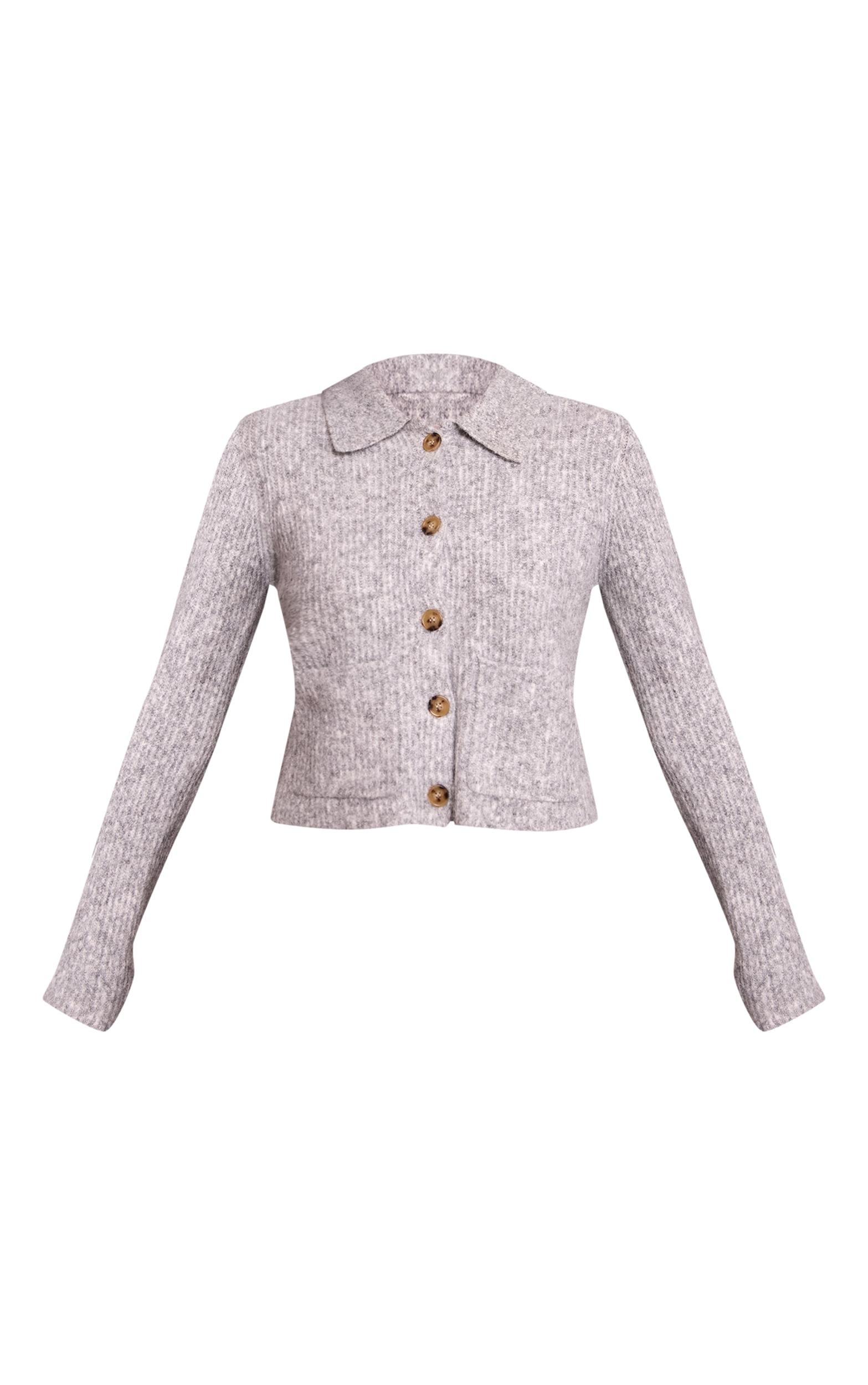 Define your essential rotation with a piece that bridges comfort and considered detail; the `grey marl soft textured knit button up collar detail cardigan` delivers a discerning edge to everyday looks. Its contemporary cropped length offers a fresh take, framed by a classic collar and neat button-up front, complete with subtle patch pockets for an elevated finish. Partner this versatile knitwear with high-waisted denim for an understated aesthetic, or layer over a simple tee and tailored pants for a more polished approach. Complete your ensemble with a pair of sleek `boots` and a delicate `gold ring` to curate a look that's effortlessly put-together and uniquely yours.Length approx 48.5cm/19inch (Based on sample size S)Model wears size SModel Height - 5ft 7inchp]:!mb-4inch>Category: KnitwearProduct type: CardigansColor: Grey MarlMaterial: KnitOccasion: Day