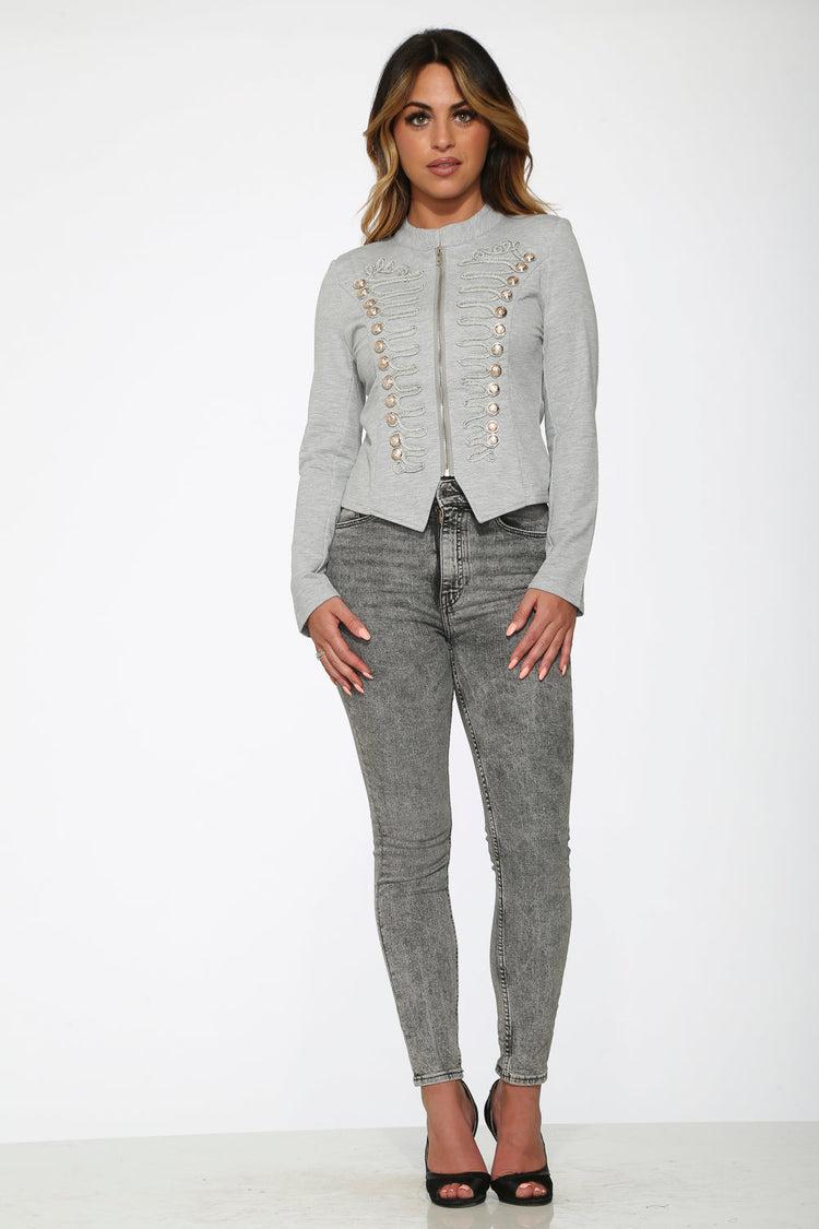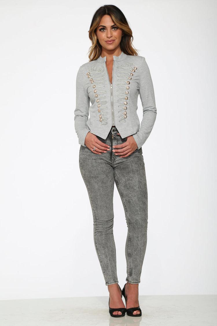 Command attention in the Orchid Bloom Grey Military Jacket—a structured yet stretchy standout that blends vintage glam with modern edge. With ornate braided trim, metallic buttons, and a tailored silhouette, this piece marches to the beat of its own (very fashionable) drum. Made from a soft cotton-spandex blend, it’s as comfy as it is commanding.By Orchid Bloom97% Cotton, 3% SpandexImportedMachine wash cold, tumble dry low or hang to air-dry