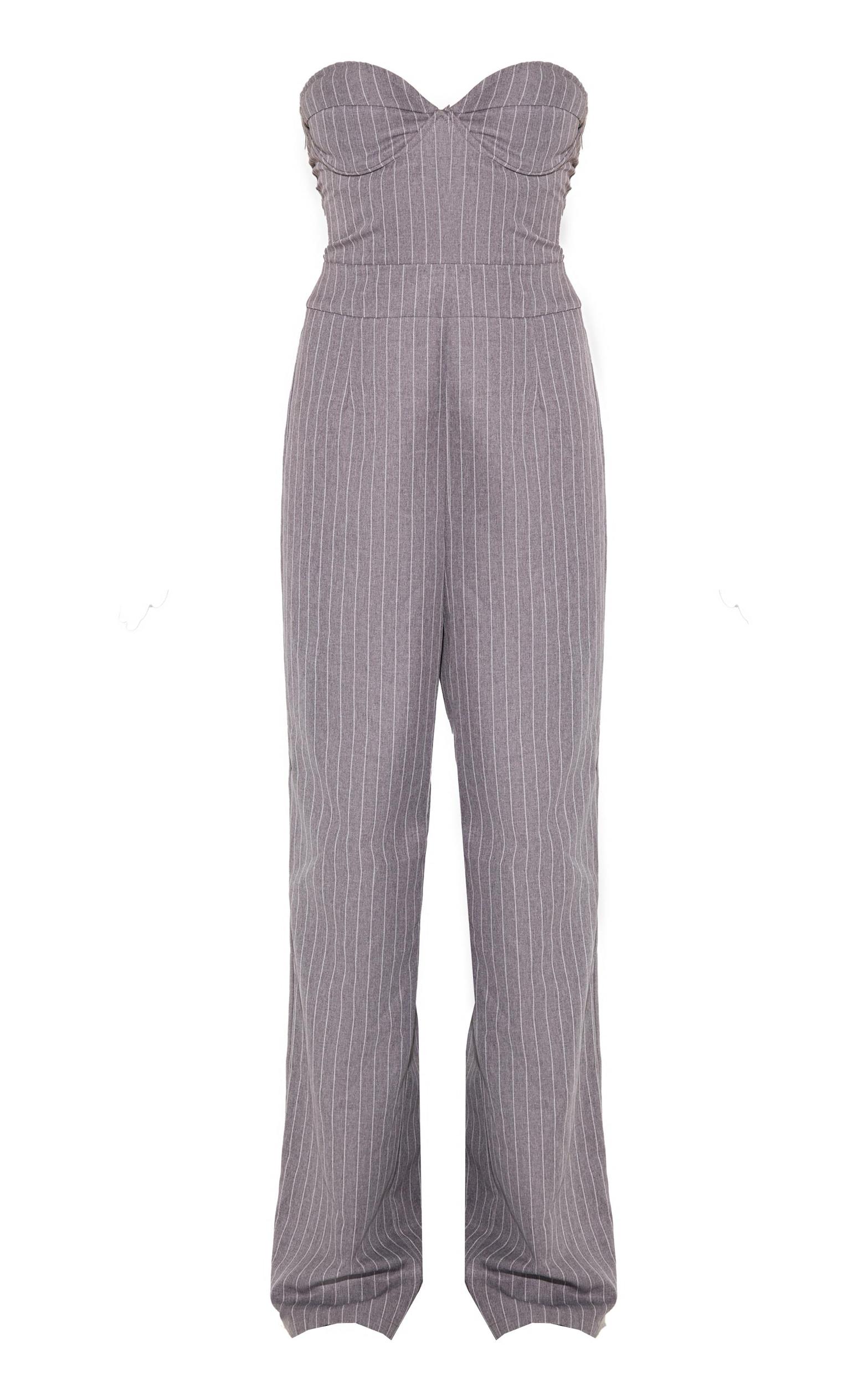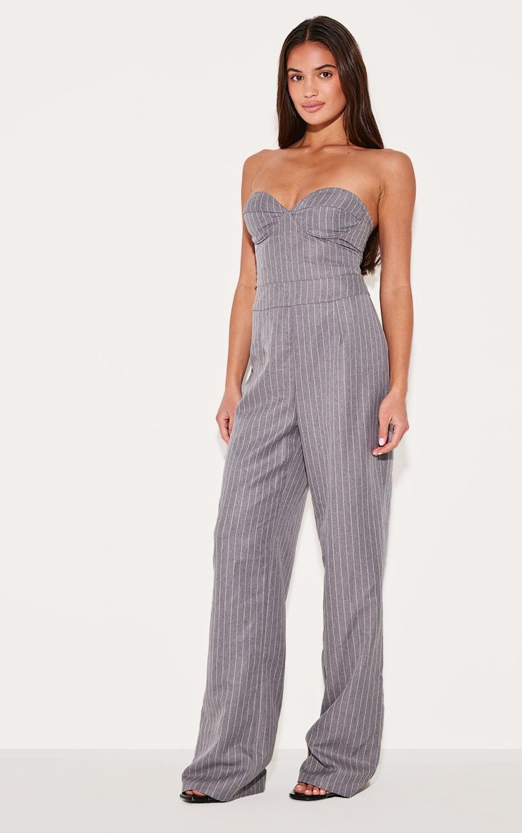 Make weekend styling easy with this grey pinstripe bandeau corset straight leg jumpsuit. Brought to you in a neutral grey shade, with a chic pinstripe design and flattering bandeau corset finish, how can you say no? Team with a pair of heels and minimal accessories for a look like no other. Length approx 160cm/63inch (Based on a sample size UK 8) Model wears size UK 8/ EU 36/ AUS 8/ US 4Model Height - 5ft 6inchp]:!mb-0inch>Category: Jumpsuits & PlaysuitsProduct type: Tailored JumpsuitColor: GreyMaterial: Tailored WovenDesign: PrintNeckline: BandeauSleeves: BandeauOccasion: Evening