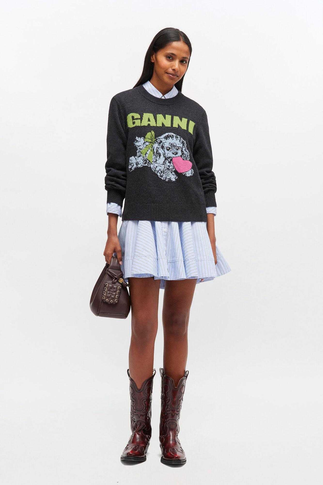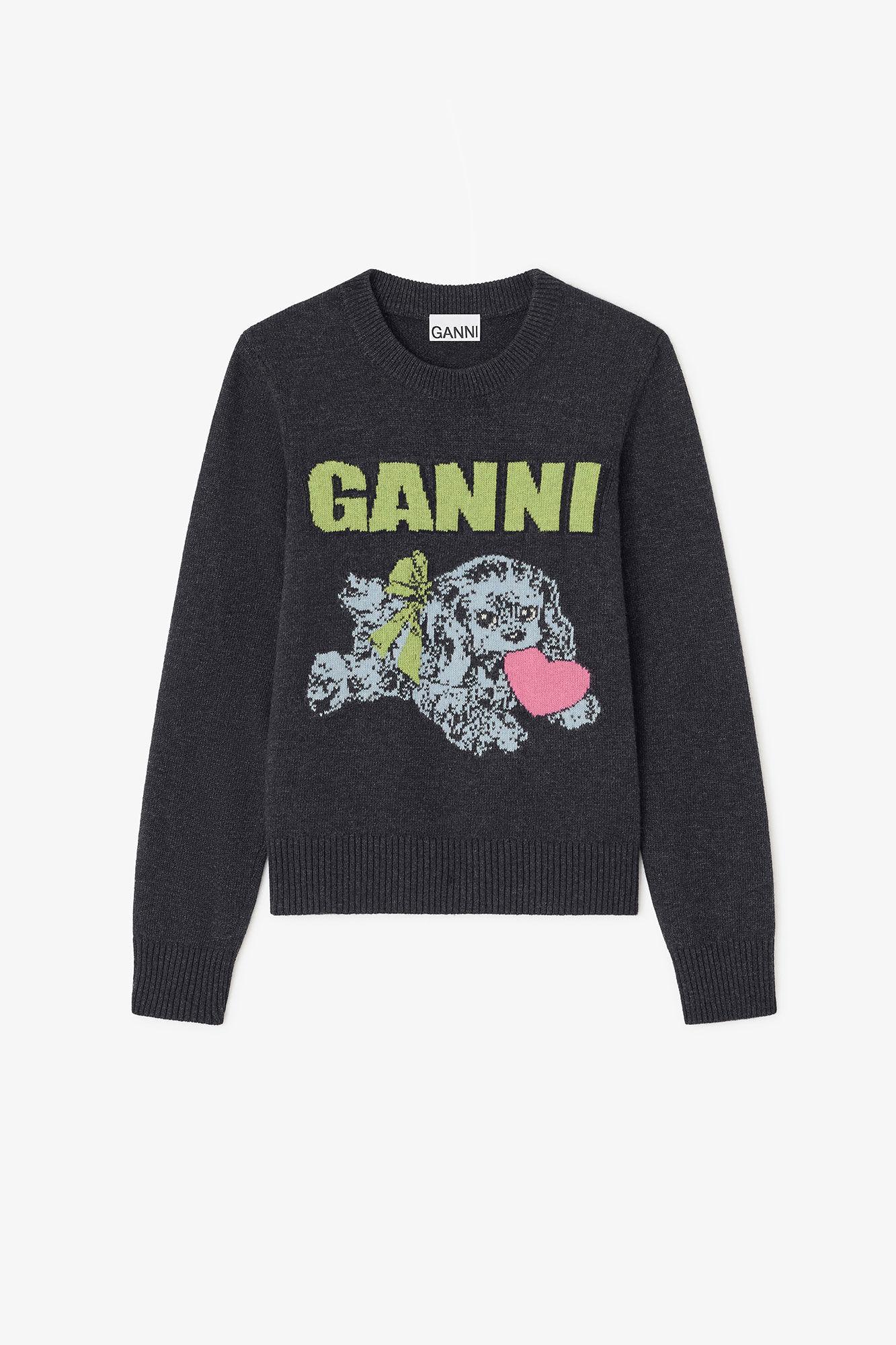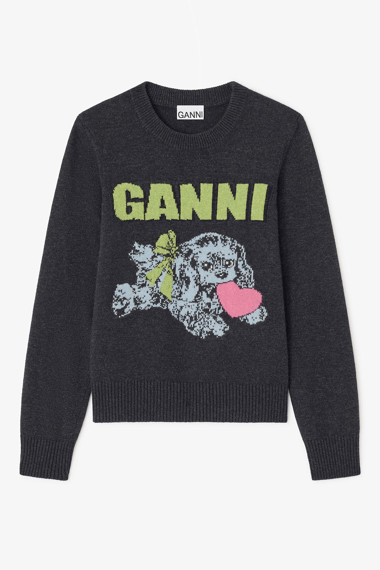 This sweater features a round neckline, long sleeves, ribbed edges, a puppy print graphic and a GANNI logo.