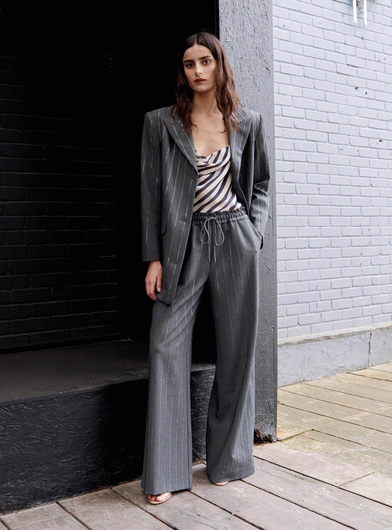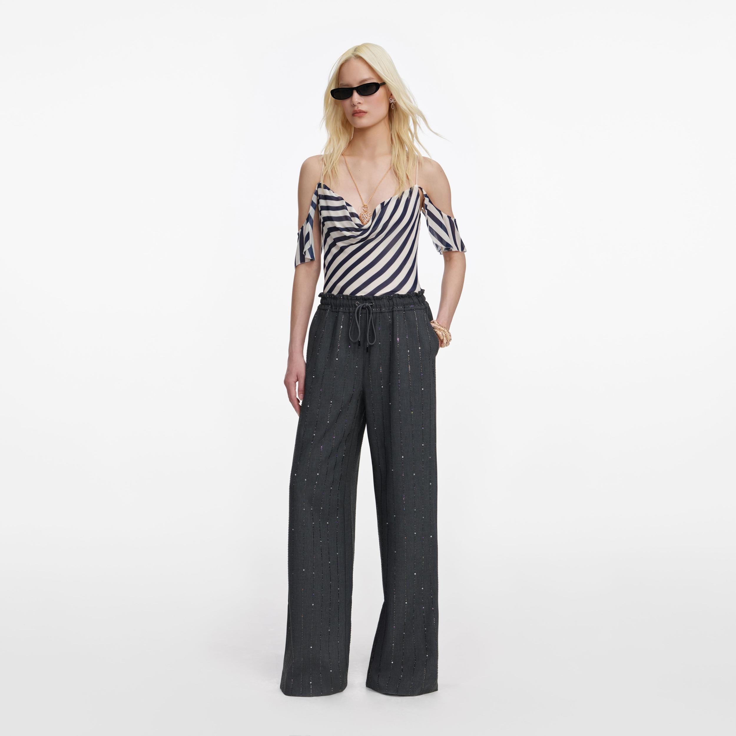Glittering with rhinestone pinstripes, these wide-legged wool trousers offer a cosy alternative to event dressing with its elasticated waistband. Add our matching jacket for extra style points.True to sizeElasticated waistbandWide-legged fitFunctional pocketsMatching blazer availableModel is 5ft10/178cm and wears a size UK 6