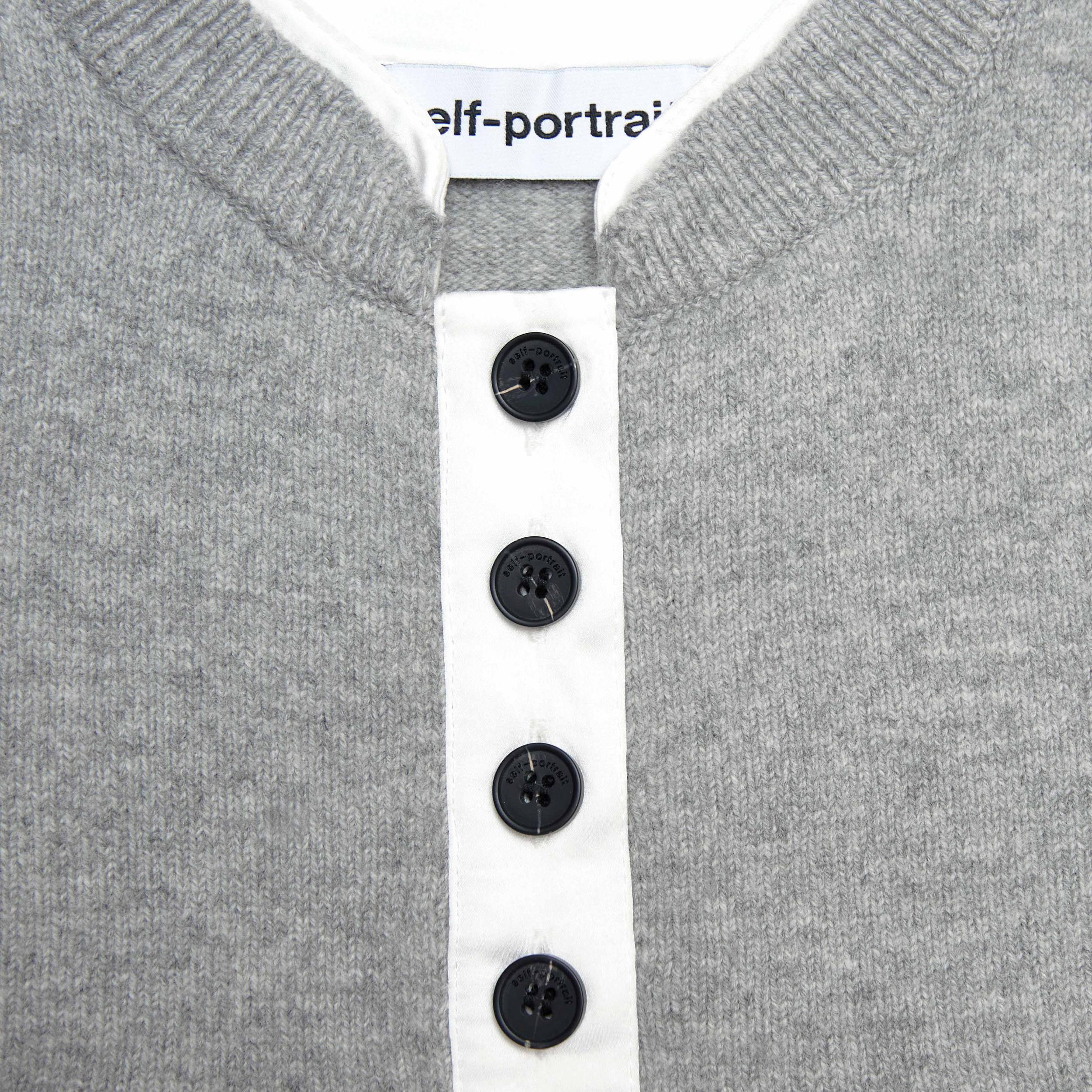 Soft and sculpted, this grey cashmere knit top boasts a contrast collar topped with statement buttons. Pair its cropped fit with jeans for day or add our matching skirt for a stylish co-ord set. True to sizeFabric has stretchContrast fabric at centreCropped lengthMatching skirt availableModel is 5ft10/178cm and wears a size S