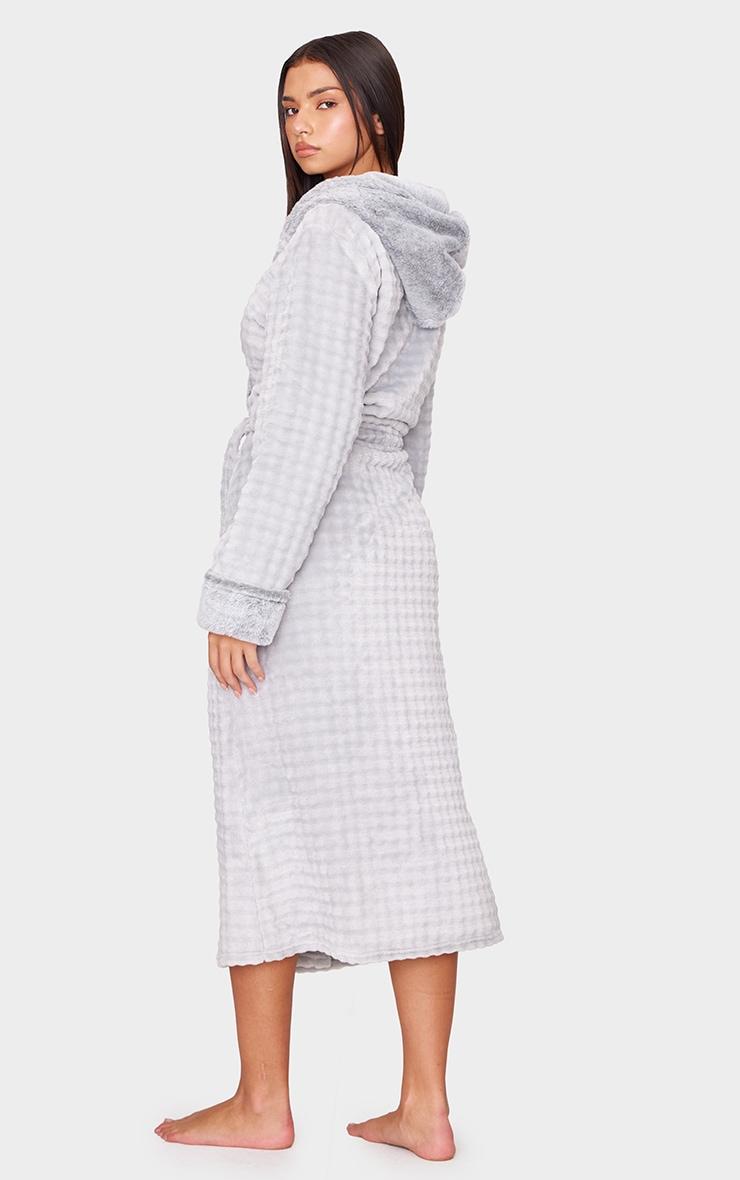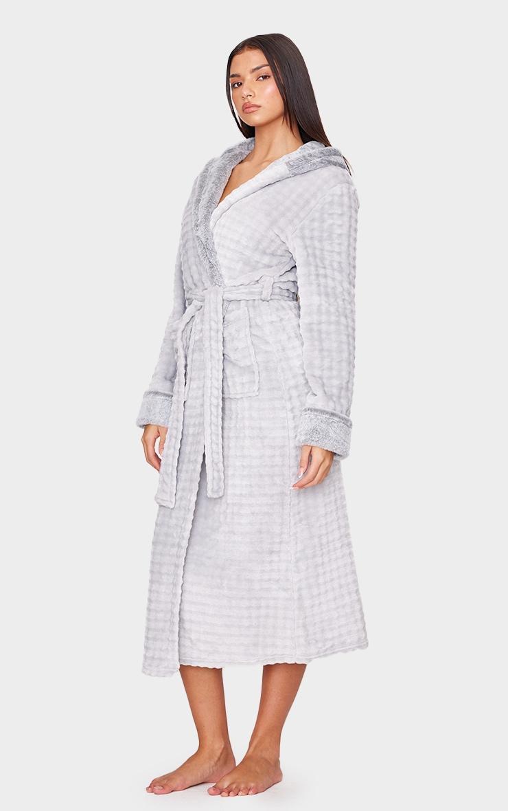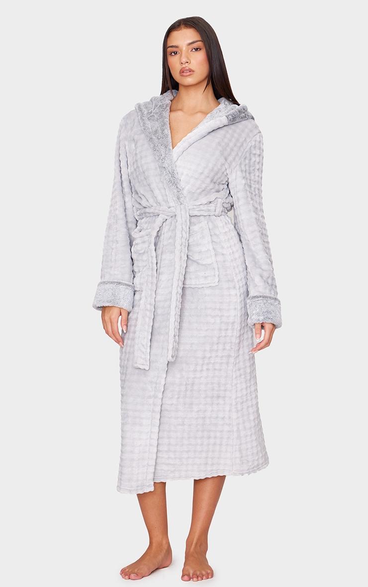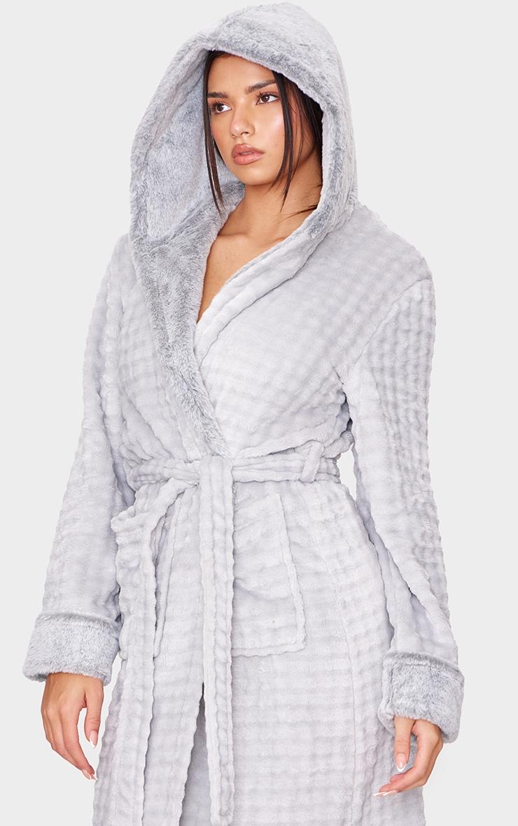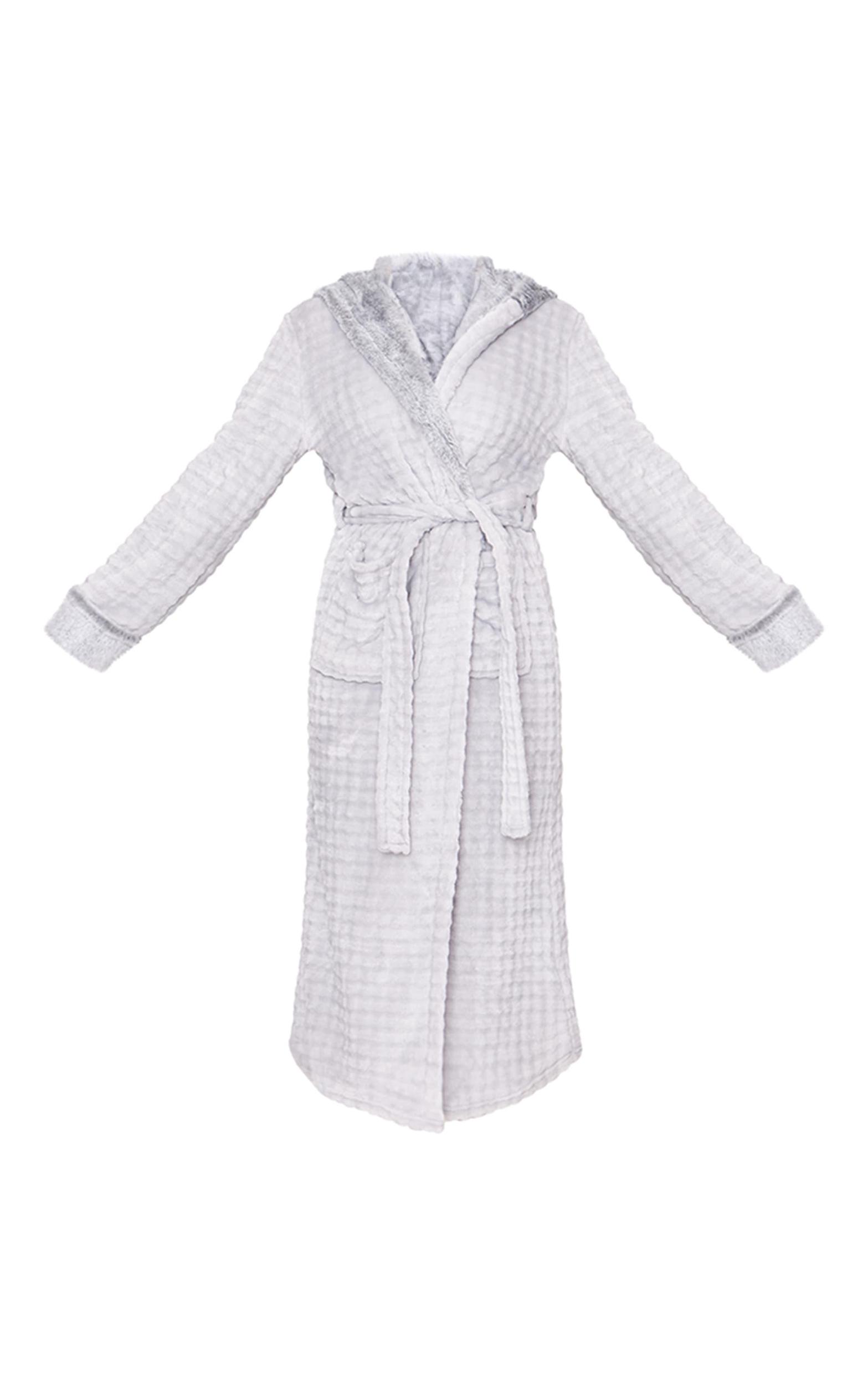 Wrap up warm in this grey stripe faux fur trim hooded bath robe. Brought to you in a grey faux fur material with a trim detail and a hooded design, this bath robe is sure to become your new go-to. Team with your fave accessories and some fluffy socks for a fool proof finish. Length approx 135cm/53inch (Based on a sample size S) Model wears size SModel Height - 5ft 8inchp]:!mb-0inch>Category: Lingerie & NightwearProduct type: Bath RobeColor: GreyMaterial: Fleece