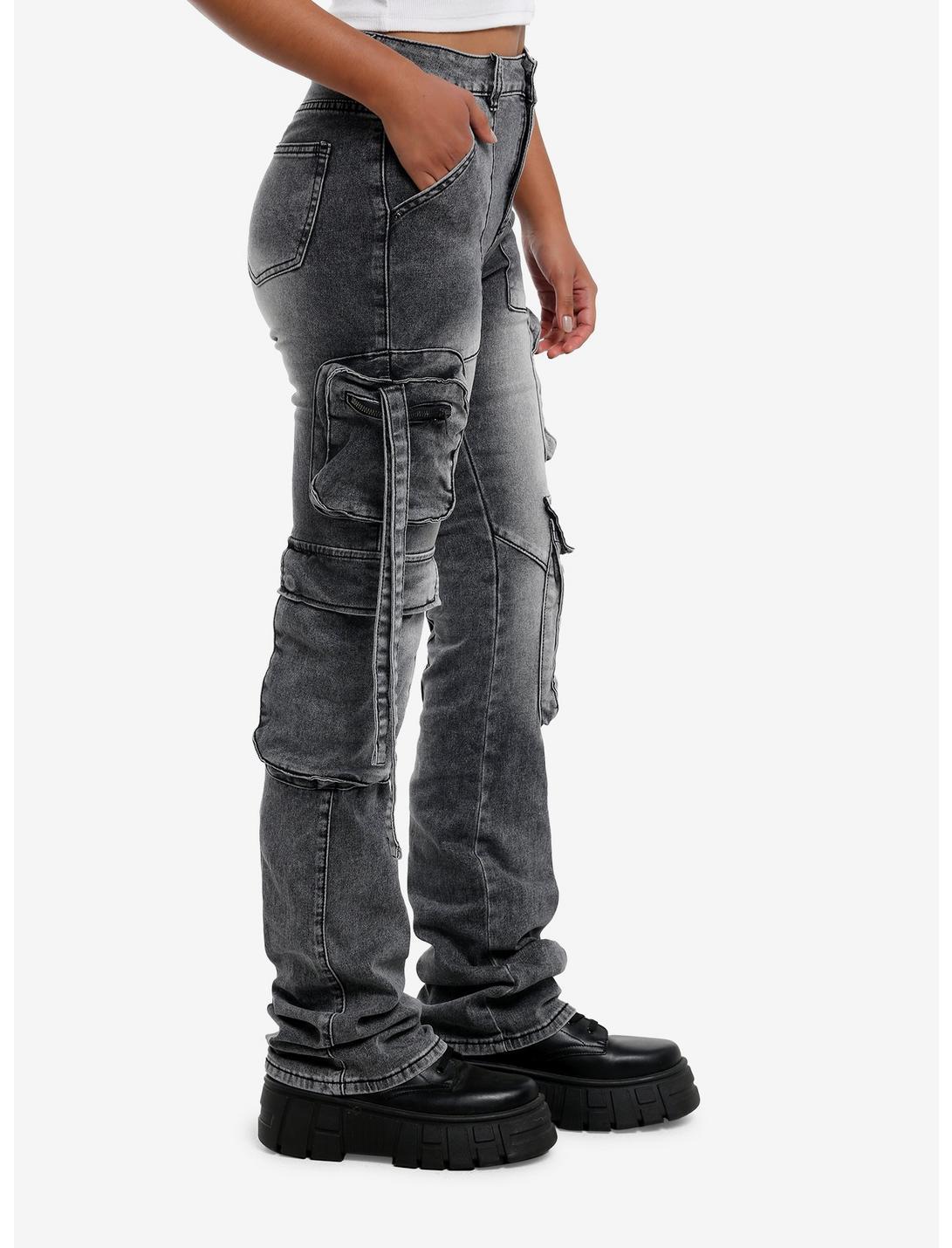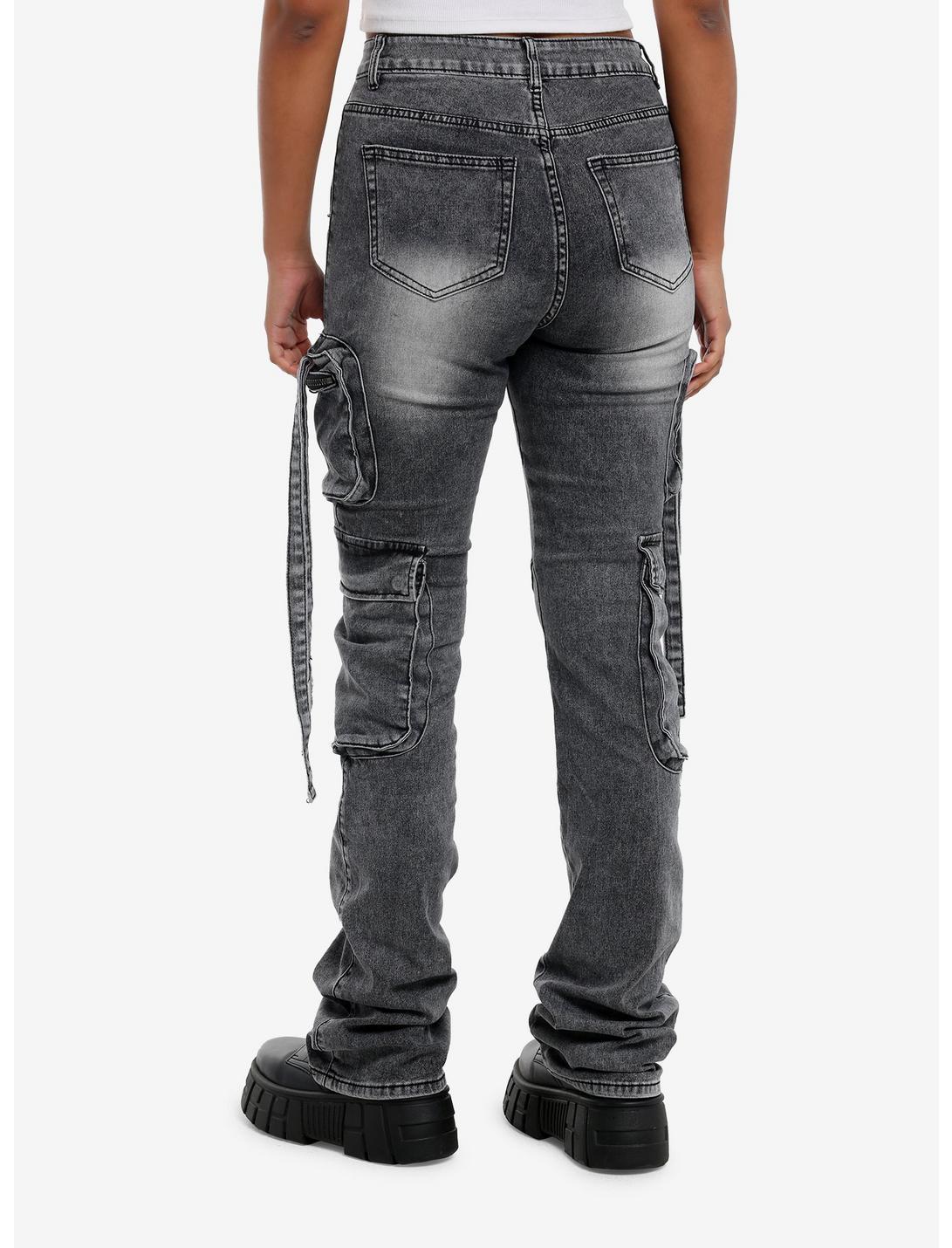 Make your denim look more edgy with these grey washed pants! They have a stacked pant style and feature cargo pockets on the legs and strap detailing. Please note: Wash pattern may vary.Please note: Style is fitted with no stretch; size up for a looser fit.75% cotton; 23% polyester; 2% spandexWash cold; dry flatNon-stretch materialRise: 13''Inseam: 34''ImportedListed in junior sizesModel is 5'9''Model wears size Small