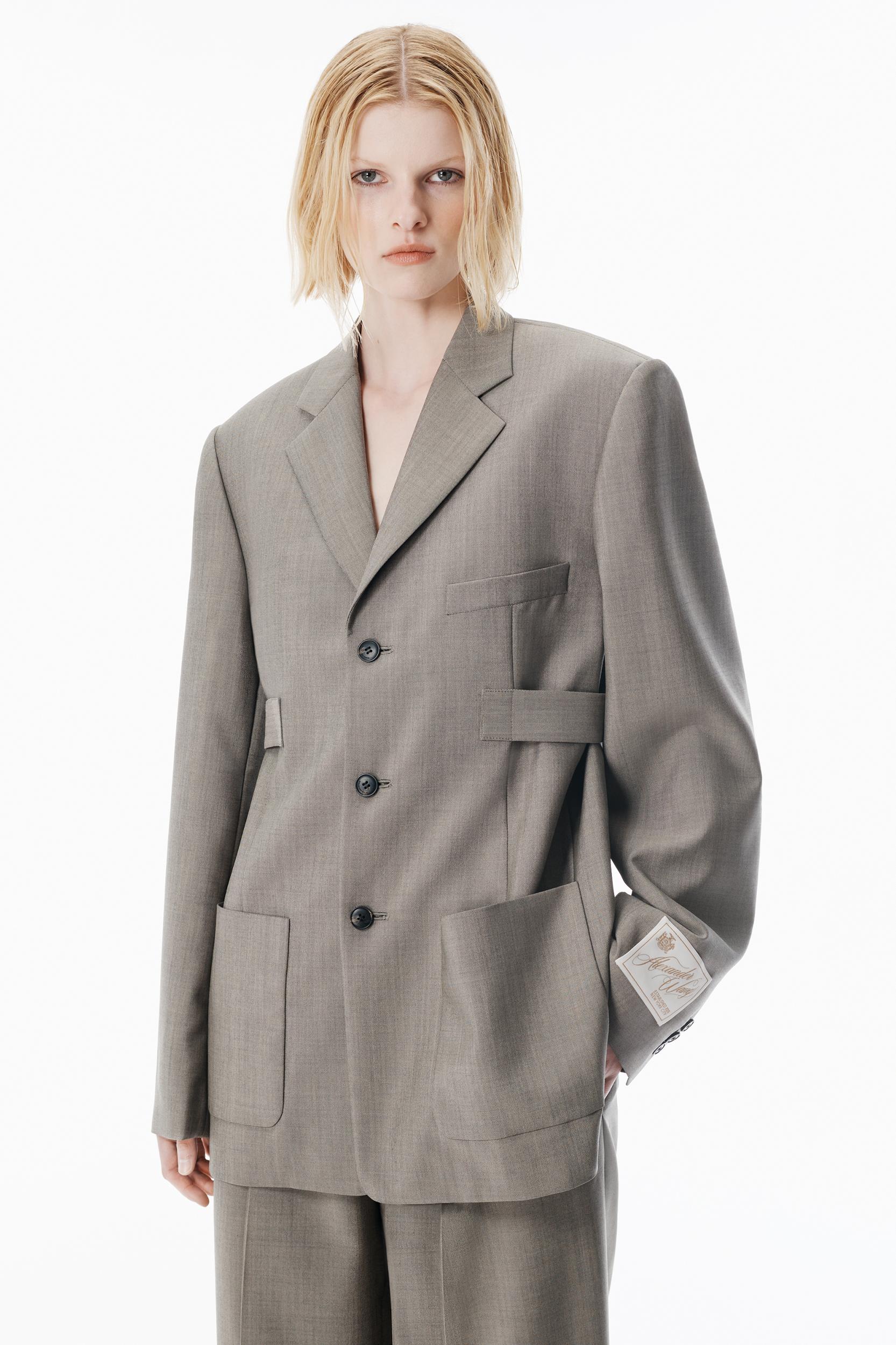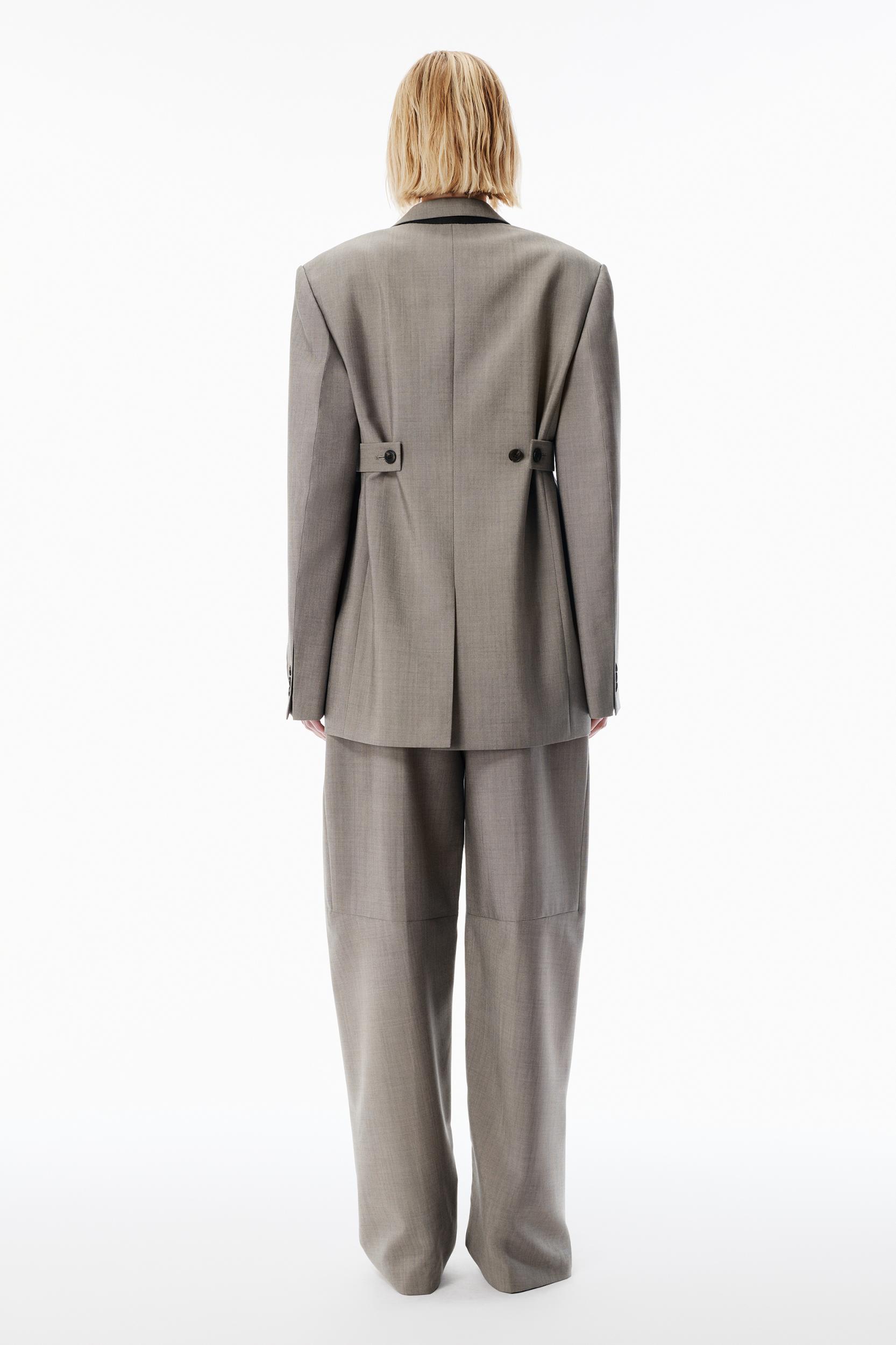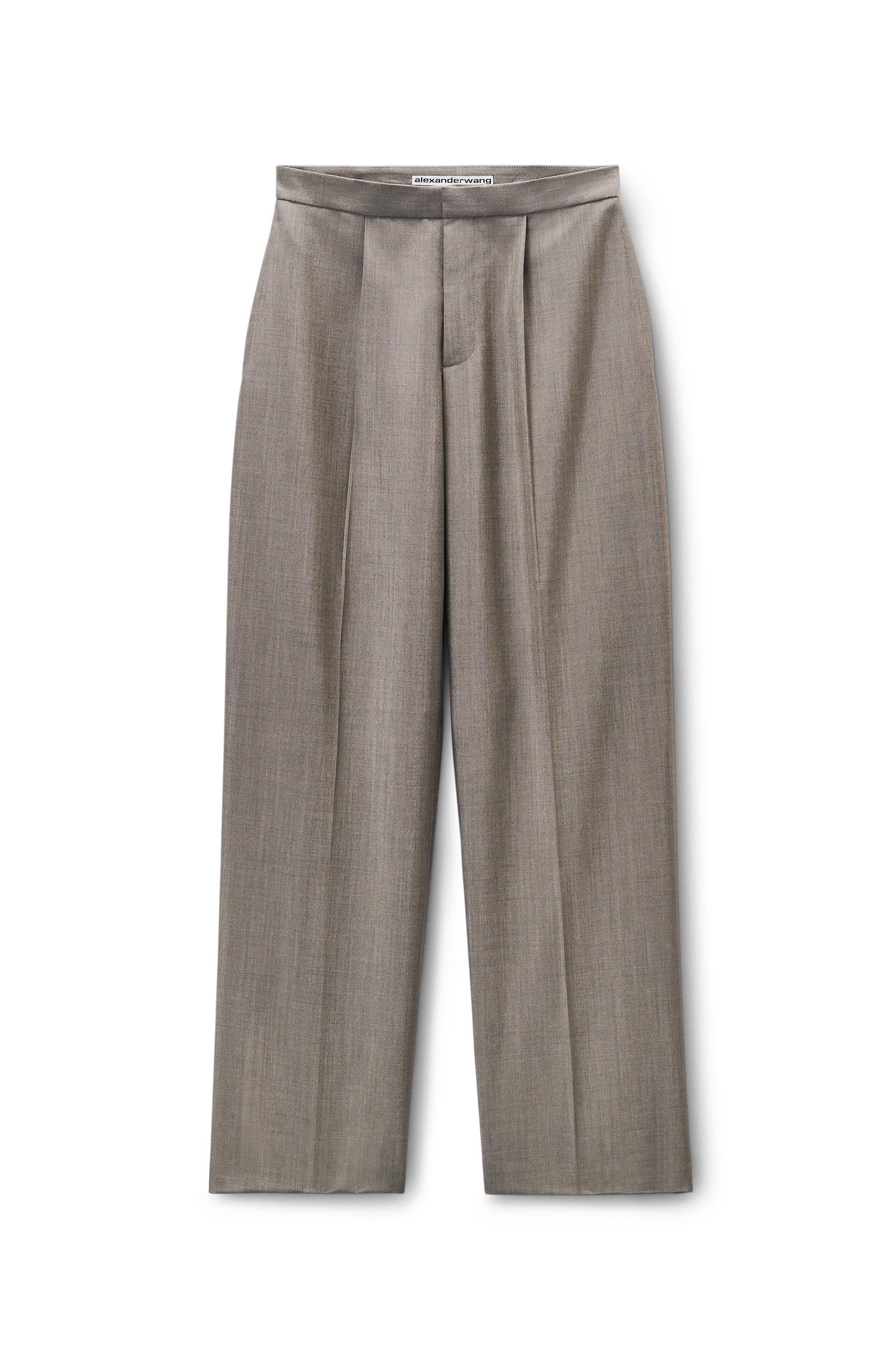 Tailored mid-rise pant in grey wool mohair suiting with a classic fly front and inseam pockets. Designed to stack at the floor for an oversized feel, it features articulated back knee seams, welt pockets with a button closure, and a branded tailoring label.