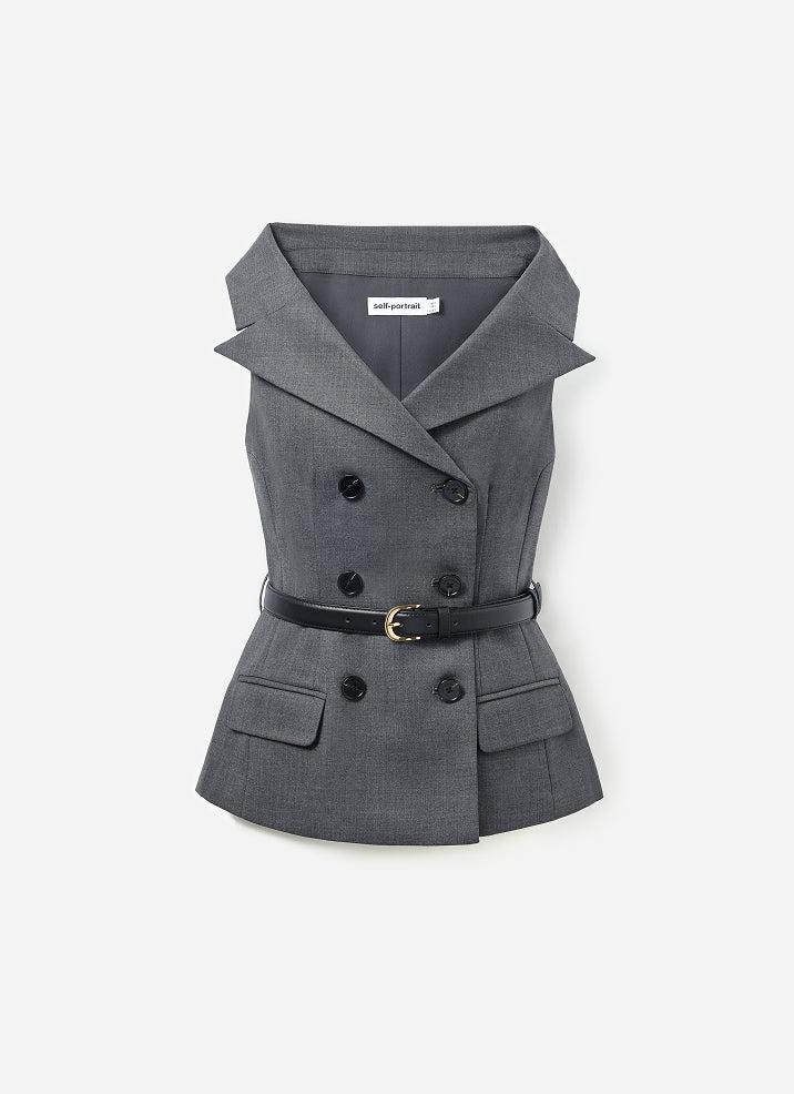 Classic tailoring comes with contemporary flair, courtesy of this grey wool top's Bardot neckline. Sparkling buttons and a peplum waist add extra chic detail – wear with jeans for off-duty chic. Fitted style, take one size up if between sizesThis style has minimal stretchDouble-breasted button closureFunctional pocketsRemovable beltModel is 5ft10/178cm and wears a size UK 6