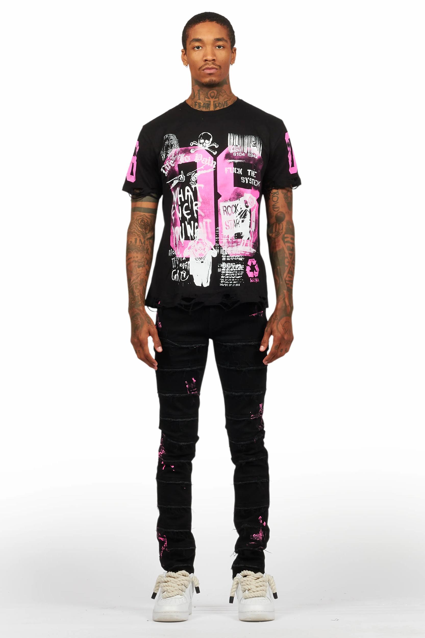 An urban graphic tee and slim-fit denim jean set for men. Designed with organic cotton and distressed detailing for a must-cop streetwear set. Crew neckline Short sleeves Regular-fit Pullover style Zip fly with button closure 5-pocket build Slim-fit Frayed seams Distressed detailing *Our denim was designed to be a slim fit cut. We recommend you to size up one size if you want a slightly looser fit.