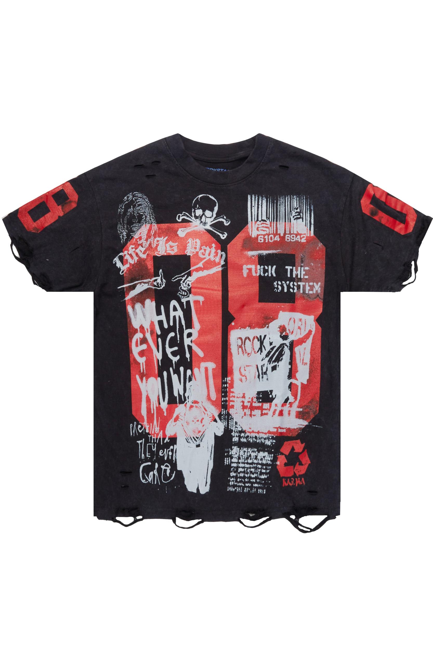An urban streetwear t-shirt for men in black. Designed with organic cotton and custom detailing for a must-cop staple tee. Crew neckline Short sleeves Relaxed-fit Custom RSO graphics Deconstructed hem Pullover style