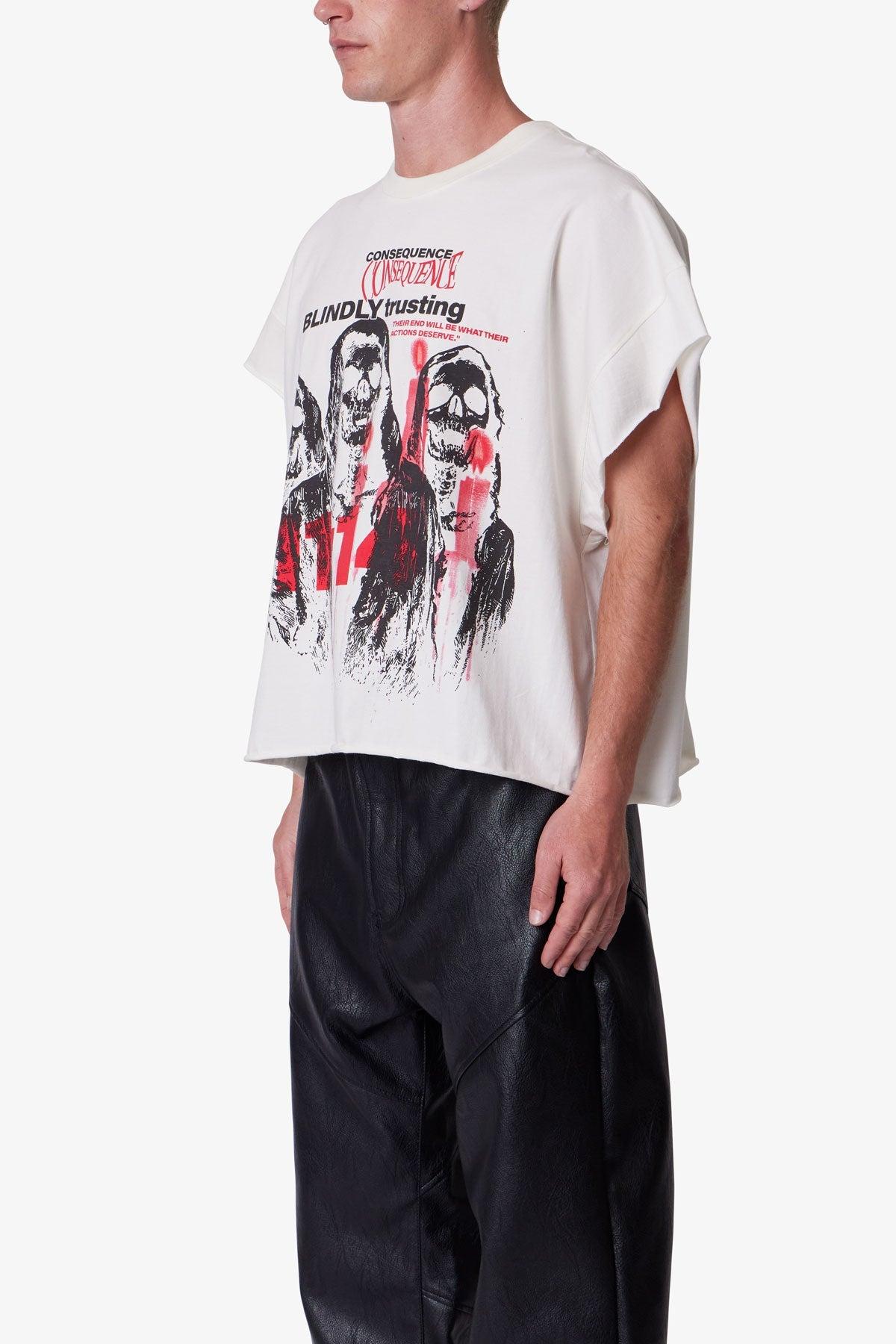 Constructed from 100% cotton with a vintage wash, this sleeveless tee features a cropped, boxy fit. Designed with raw cut arm holes and hem, it's detailed with cracked grim artwork screen printed on the front and back. Finished with a ribbed neck. details Cropped, boxy fit Vintage washed 100% cotton Sleeveless design w