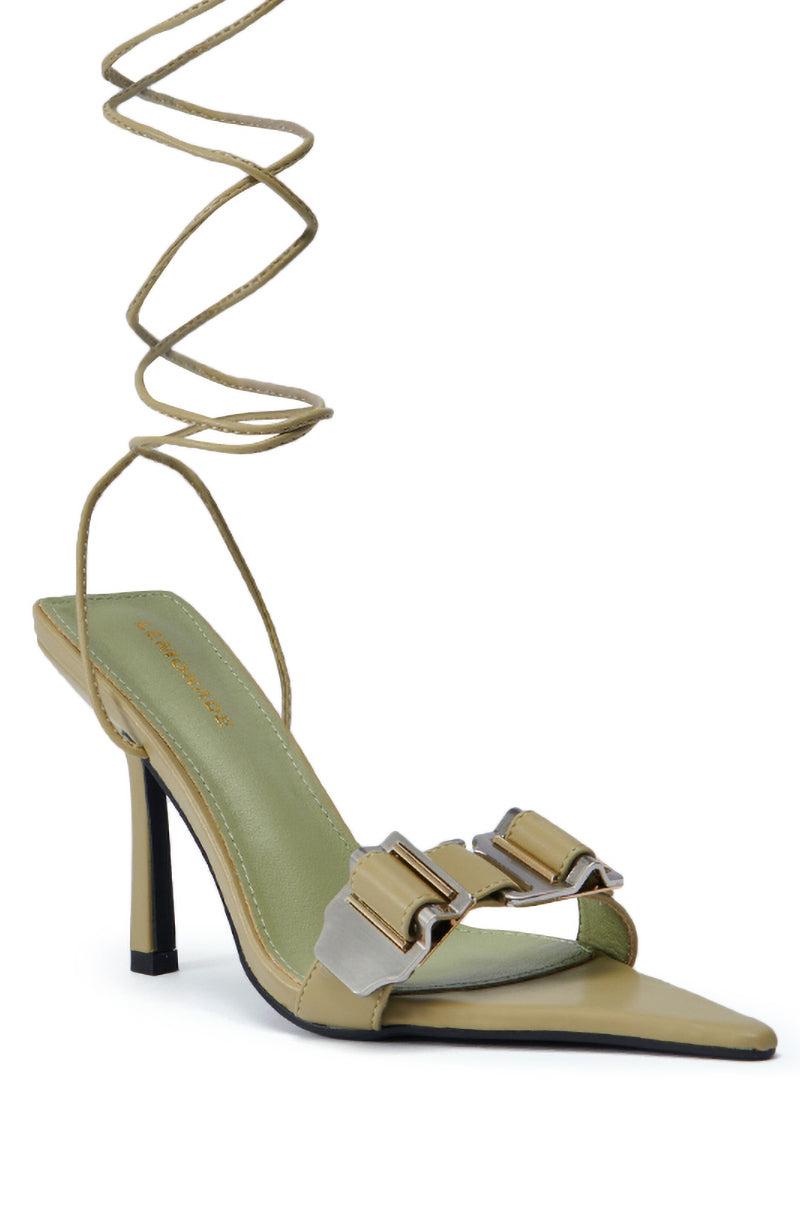 The Ground Work Sage Pointed Toe Silver Hardware Sandal is a sleek style crafted from smooth faux leather in a trendy sage green shade. This strappy sandal features a pointed toe silhouette, stiletto heel, a singular footband with industrial-style silver hardware, and self-tie, wrap-around ankle straps. Style them with a midi dress and a coordinating clutch for a polished look. - Faux Leather Upper- Open Pointed Toe- Stiletto Heel- Imported (all measurements approximate from size 7.5)- 4” Heel HeightProduct ID: 472047
