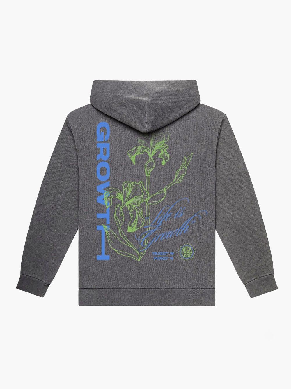 Our Growth Hoodie in heather grey features a large graphic on the back, and a smaller one on the front. Rib-knit banding at the cuffs and hem provides a snug and secure fit. Hoodie is also laced with an adjustable hood and a large front pocket. True to size. Machine wash cold with like colors. Hang to dry. Order one size up for oversized fit*
