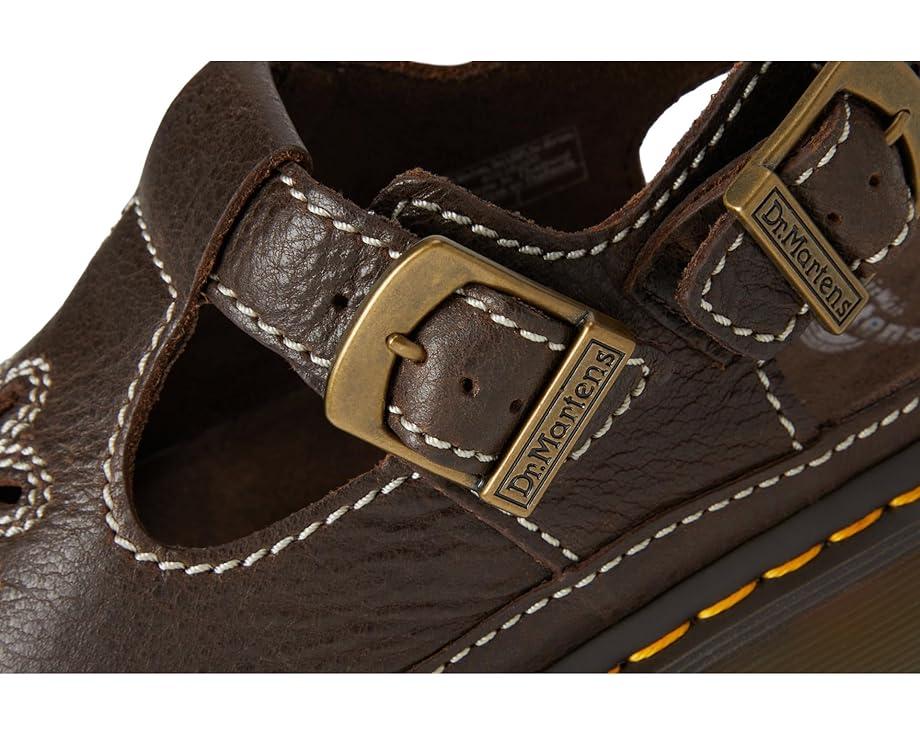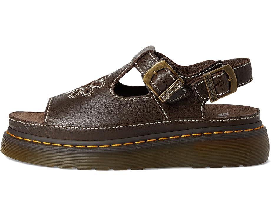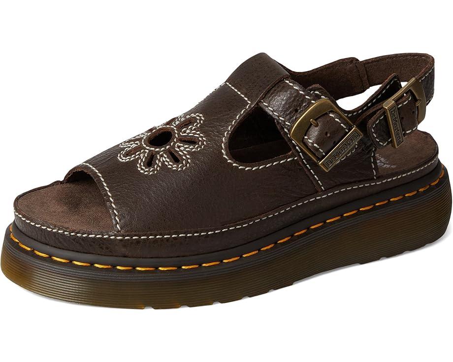 Channel the spirit of the 90s with a silhouette inspired by the first collection of Dr. Martens sandals. The Dr. Martens® Dunnet Flower sandals have two adjustable buckle straps to help you find the perfect fit and a suede-covered foam footbed for enhanced comfort. These heeled sandals are made of a leather upper and suede lining. The yellow welt stitch adds to their durability while the grooved Quad Shore PVC outsole is air-cushioned to keep you bouncing on long summer days. Their floral cut-out design is exaggerated by contrast stitching for a stylish appeal.