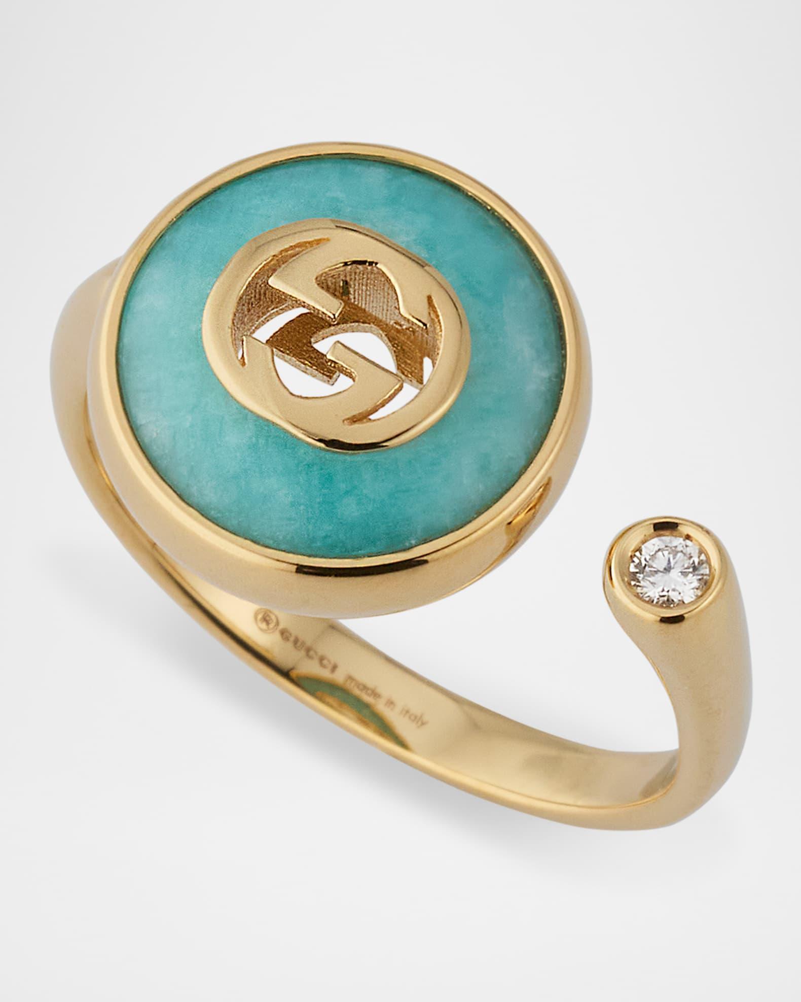 An amazonite inlay surrounds the iconic double-G logo for this Gucci Interlocking ring. The open ring is finished with a single diamond on the opposite end. Polished 18-karat yellow gold 0.028 total diamond carat weight Made in Italy