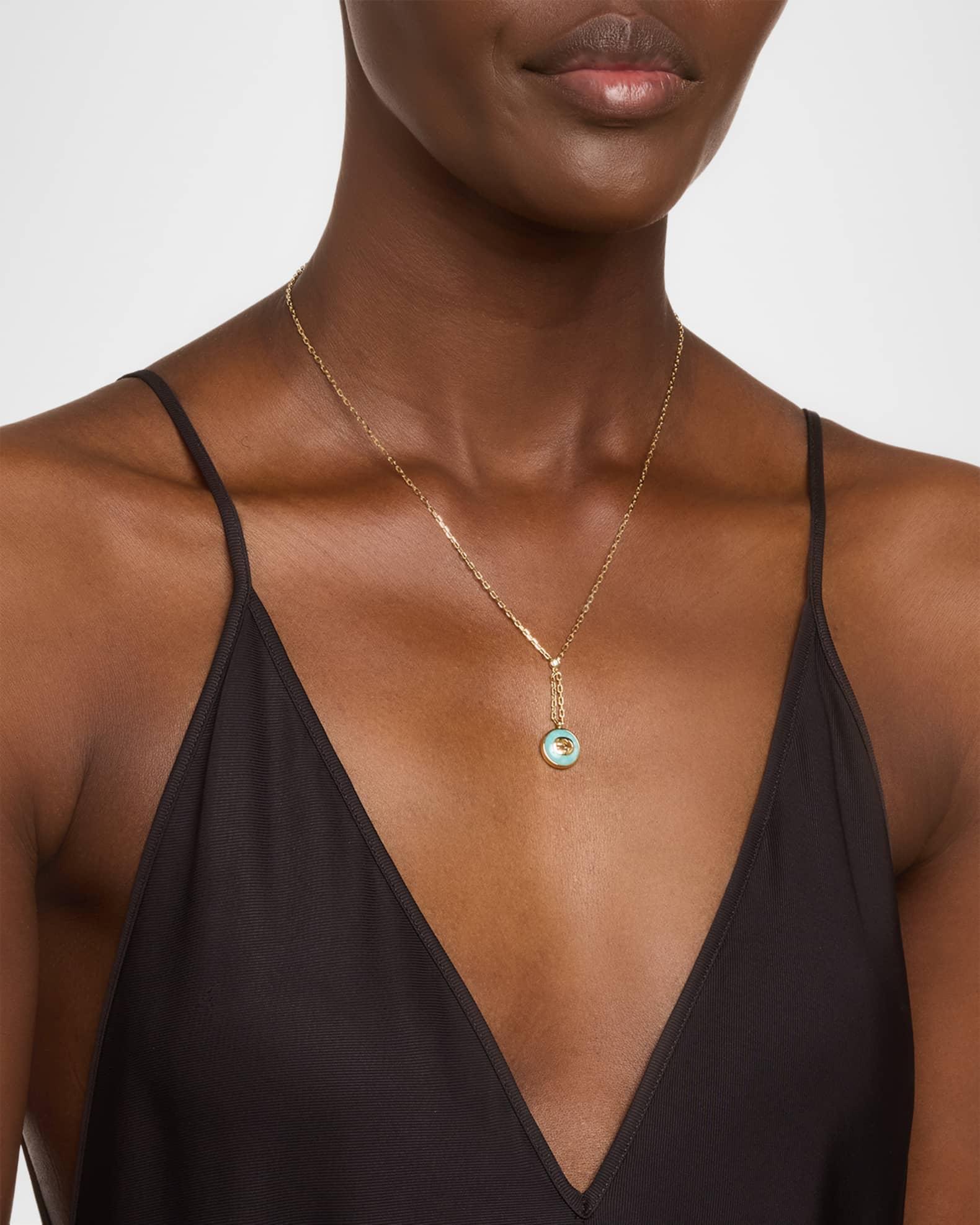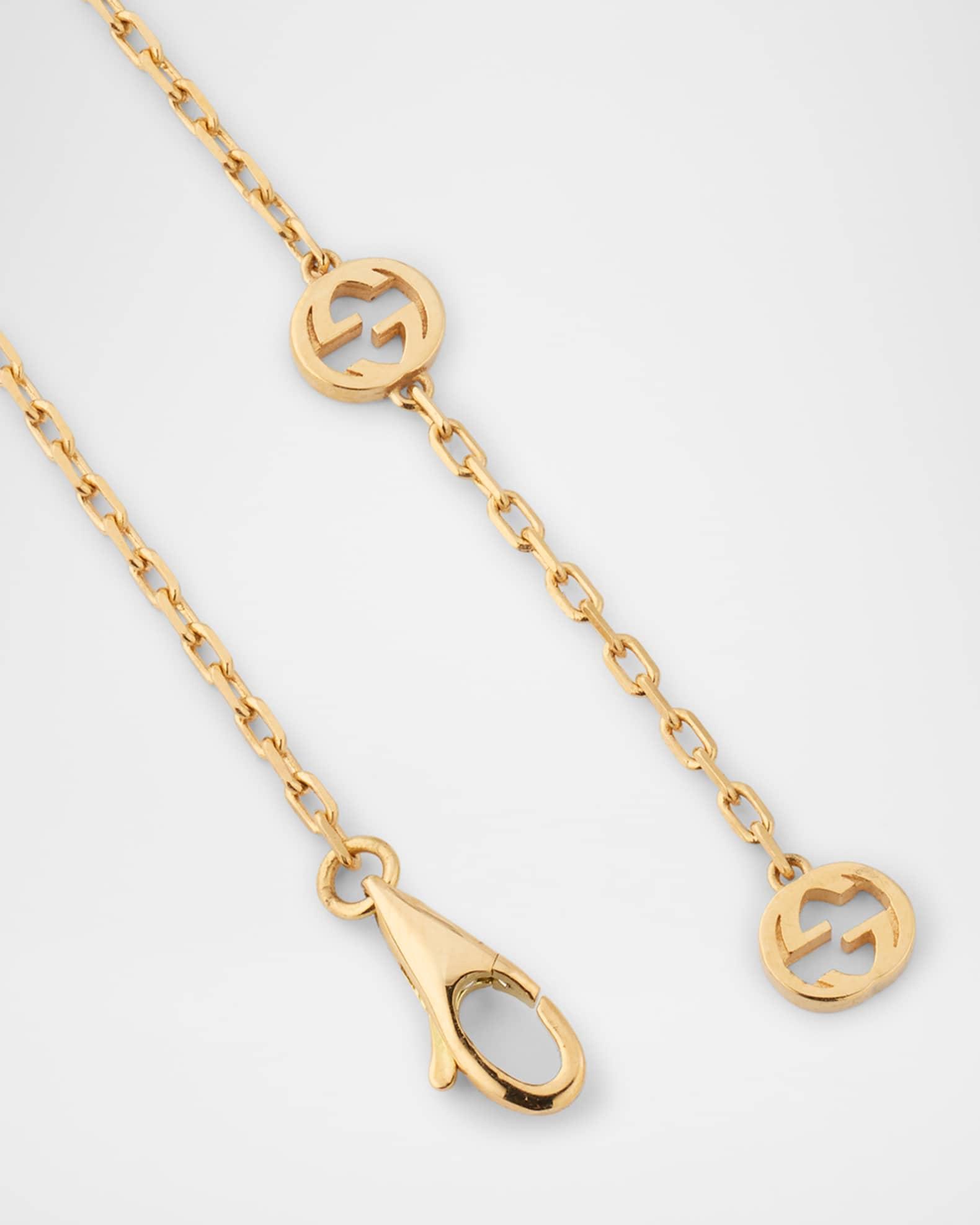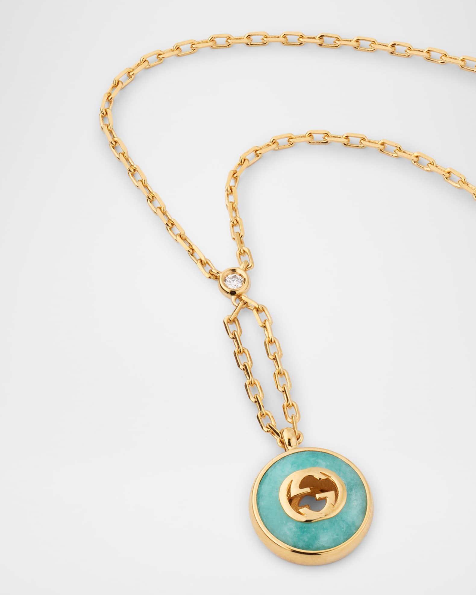 An amazonite inlay surrounds the iconic double-G logo for this Gucci Interlocking necklace. The Y-drop is finished with a single round white diamond bezel. Necklace length: approx. 16.5 inches Polished 18-karat yellow gold 0.028 total diamond carat weight Adjustable length Lobster clasp Made in Italy