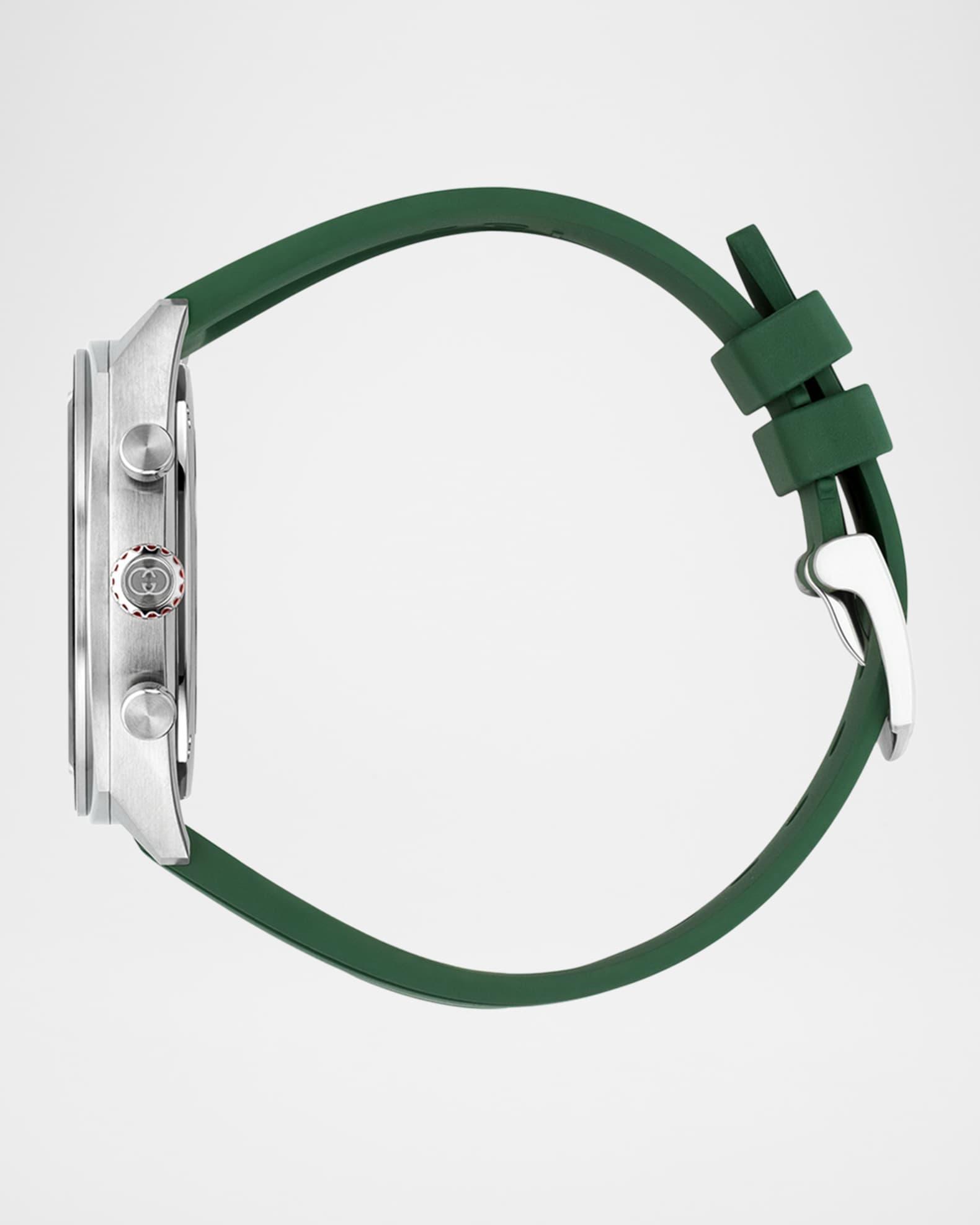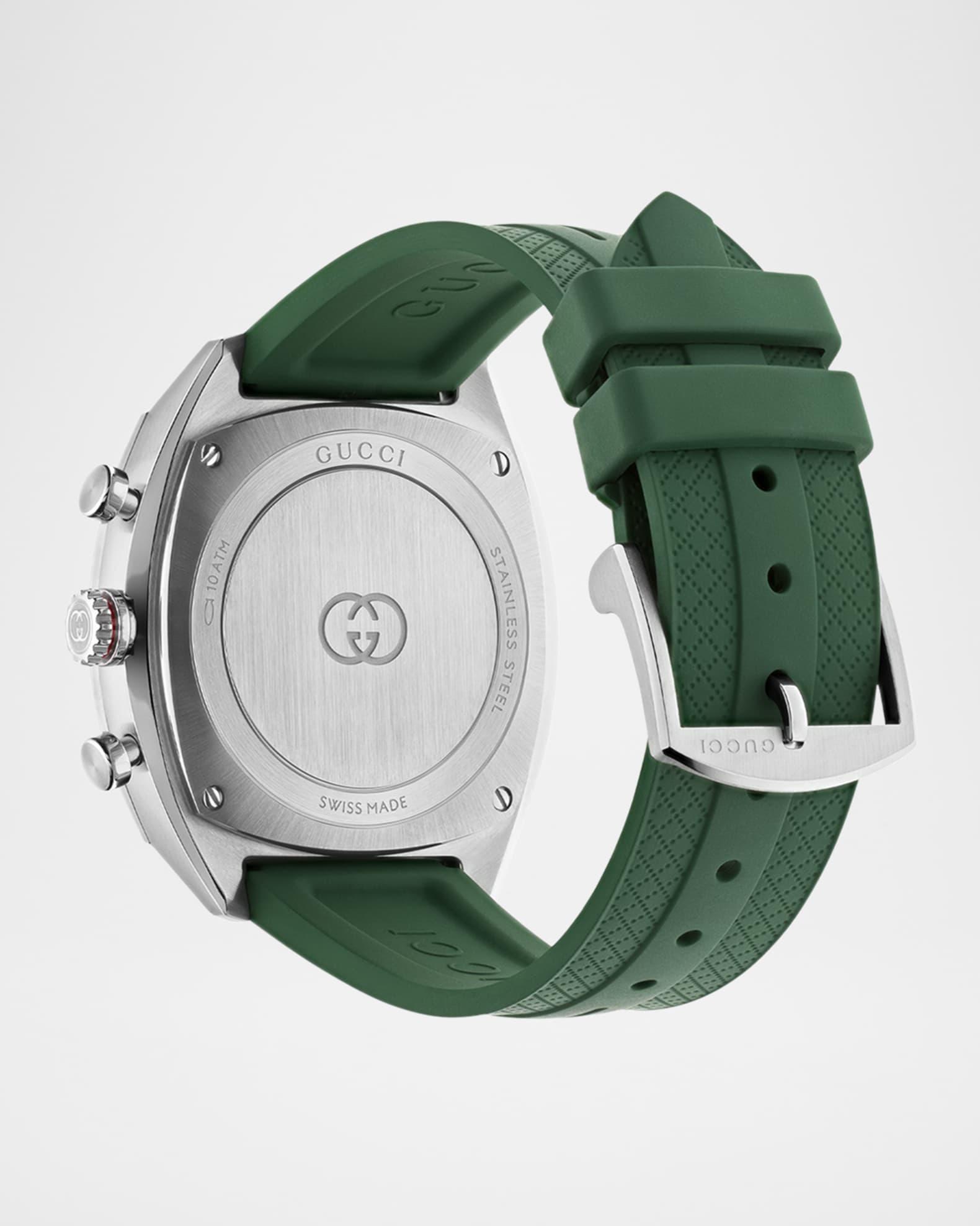 Gucci watch from the Interlocking line, highlighting archival symbols of the House 41mm; round stainless steel case Sapphire glass with anti-reflective coating Tachymeter bezel Green dial; three subdials Logo at 12 o'clock Rubber strap Branded pin buckle Quartz movement with chronograph function Water resistant at 10 ATM Made in Switzerland