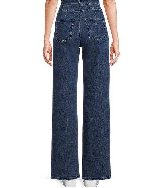 From Guess, these pants feature: High rise Double-button waistband with side tabs for a chic, nautical look Zip-front closure 2 side front pockets Sailor-inspired button detailing 2 back pockets Wide legs Structured silhouette Cotton denim Machine wash/tumble dry Imported.