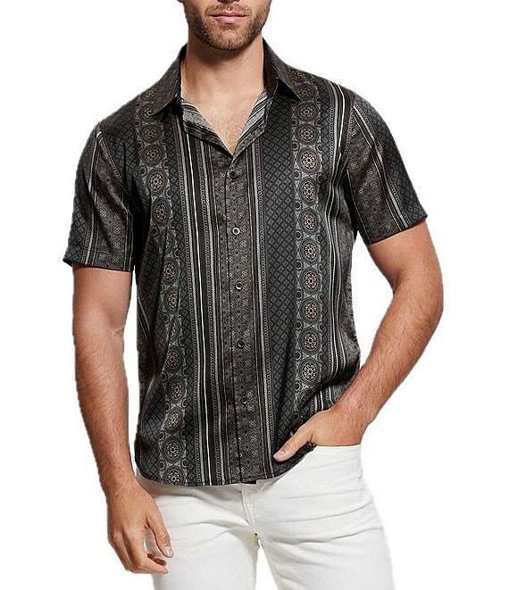 From Guess, this shirt features:Mosaic stripe patternPoint collarShort sleevesShirttail hemFull button front closurePolyester/spandexMachine wash/line dryImported.