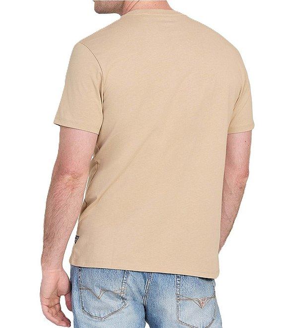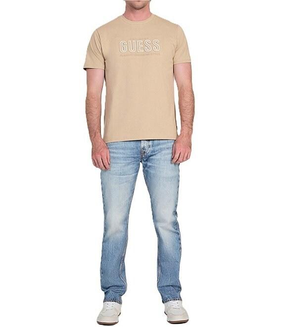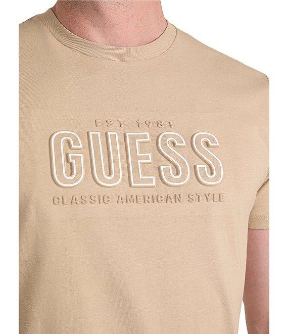 From Guess, this t-shirt features: Crew neckline Short sleeves Tonal embossed "Guess" logo on the front Straight hem Pullover construction Organic cotton jersey Machine wash/tumble dry Imported.