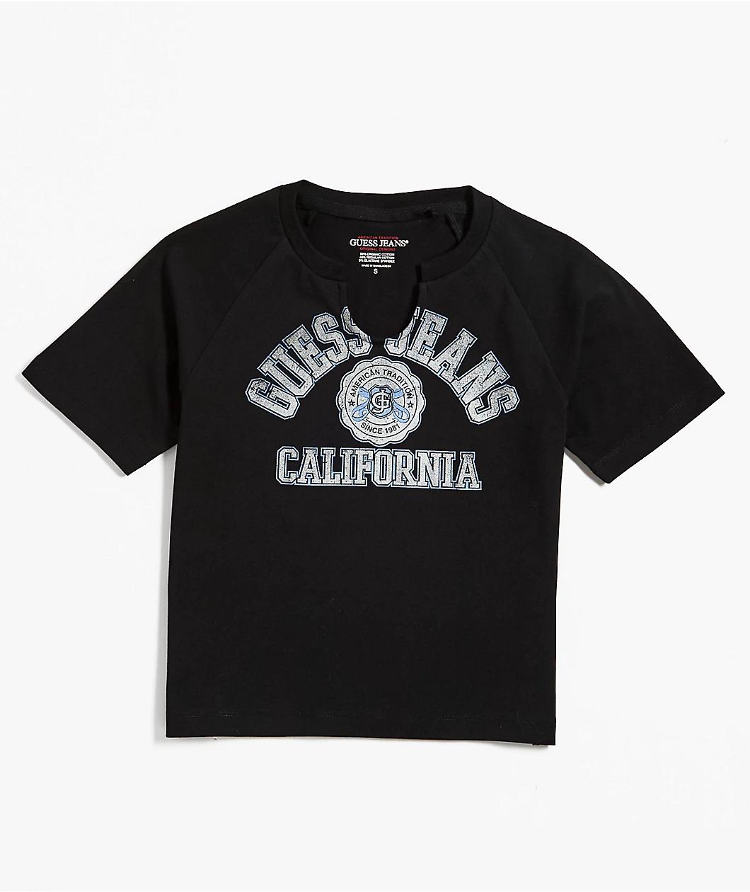 Designed with a coquette style from Guess Jeans, the Notch Neck crop t-shirt lands in a solid black cotton build with screen-printed branding on the front. Inspired by college athletic uniforms, the front of the baby tee showcases bold, arched branding ab